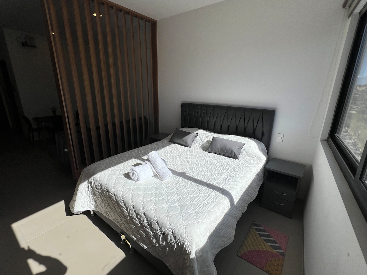 Hermoso Departamento monoambiente independiente ubicado en el centro histórico de Tarija, a 3 cuadras del mercado central y a 7 cuadras de la plaza principal. tienes todo lo necesario muy cerca, como ser el mercado central, farmacia, tienda de barrio, restaurantes, todo lo podes hacer caminando. cuenta con una cama de dos plazas, un comedor, un amplio baño, terraza propia en un piso superior con mesa y sillas para disfrutar el aire libre
