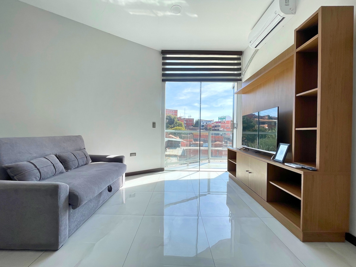 Hermoso depto en el centro de Tarija Cuenta con 1 habitación (cama Queen) y sofá cama de 2 plazas en el living. Ubicado a 1 cuadra de la plaza principal y cerca de todo: plazuela Sucre, mercado central, restaurantes, farmacias y transporte. En un condominio nuevo y moderno, con acceso sin restricciones mediante cerradura smart. 📢 Si eres de Bolivia, puedes usar tarjetas virtuales para reservar. No estamos con el tipo de cambio oficial.