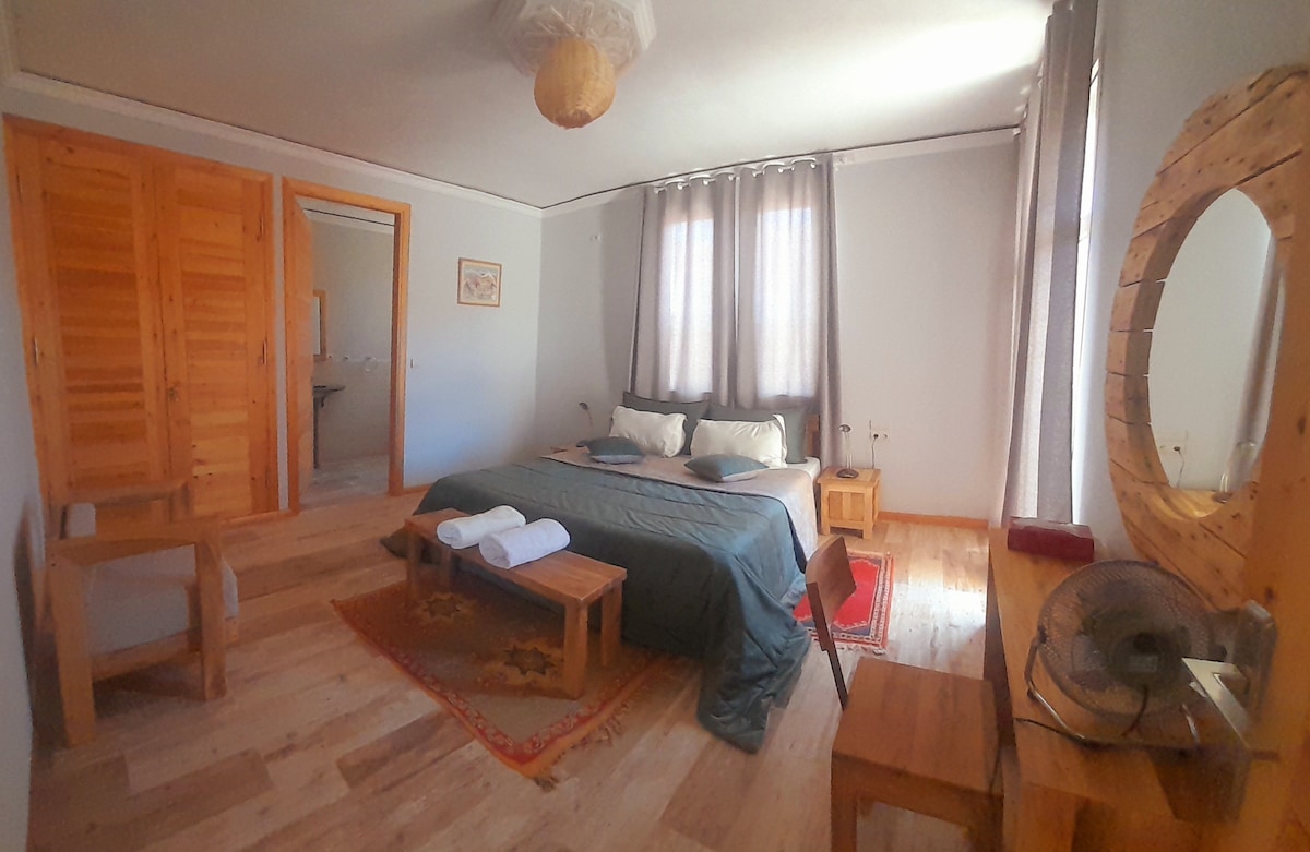 Bienvenue à Dar Bikouch, maison d’hôtes située à Assfalou, un village paisible à 3 km d’Aït Ben Haddou. Loin du stress de la kasbah, profitez de 4 chambres confortables avec salle de bain privée, climatisation, Wi‑Fi et terrasse avec vue. Petit-déjeuner marocain inclus dans le prix. Idéal pour couples, familles ou groupes en quête de calme et d’authenticité dans le sud marocain.