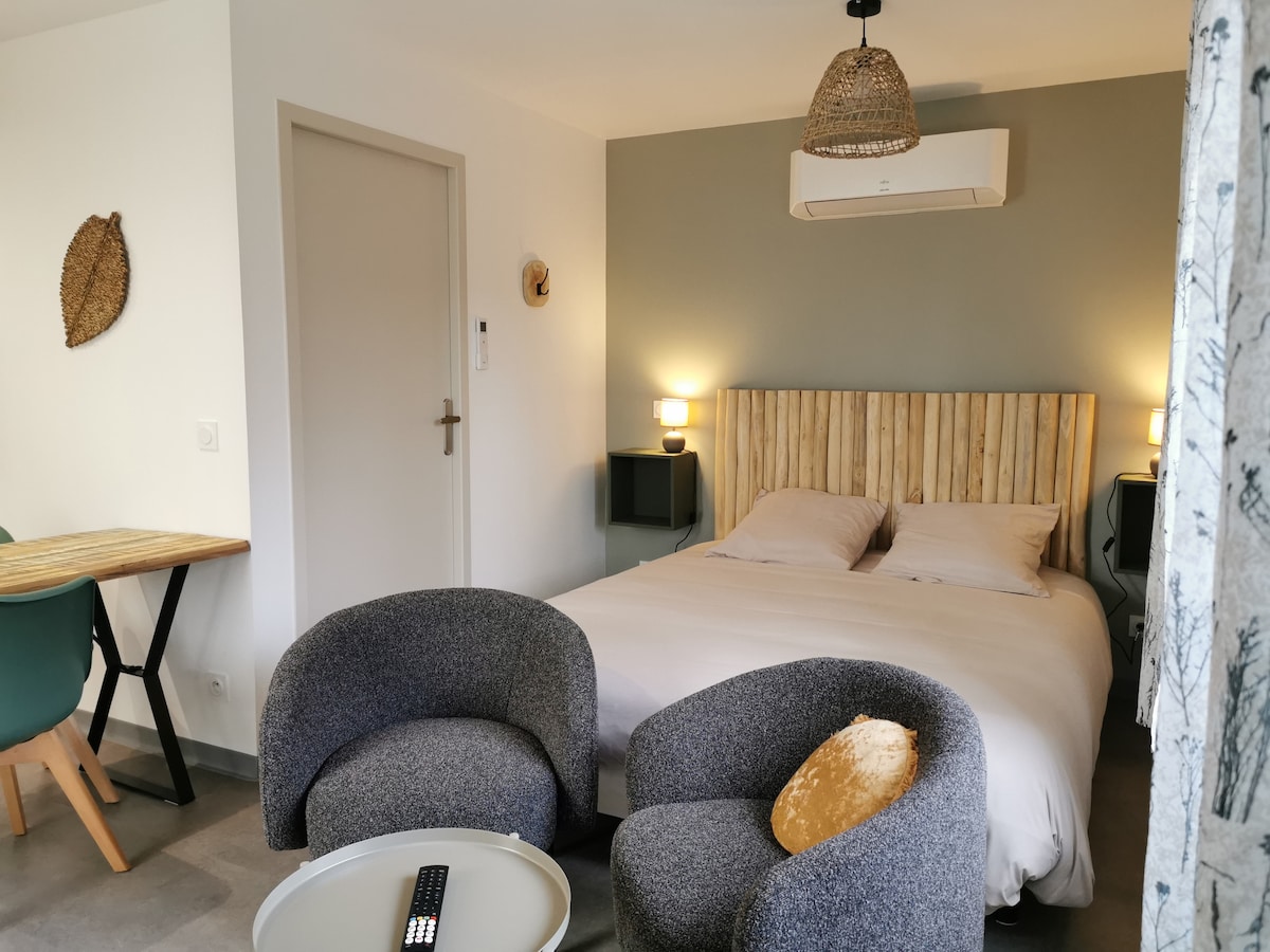 Studio "Aventurine" Séjournez dans ce logement calme en RDC dans un corps de ferme rénové. Petit coin terrasse et accès au jardin. 7 min en voiture de l'accès rocade ou du centre-ville. Grand parking juste devant la maison. Climatisation réversible. Lit confortable en 160. SDB séparée avec une douche spacieuse. Smart TV. Cafetière Senséo. Pour votre sécurité la terrasse commune ainsi que le parking sont sous vidéo surveillance. Pas de frais de ménage.