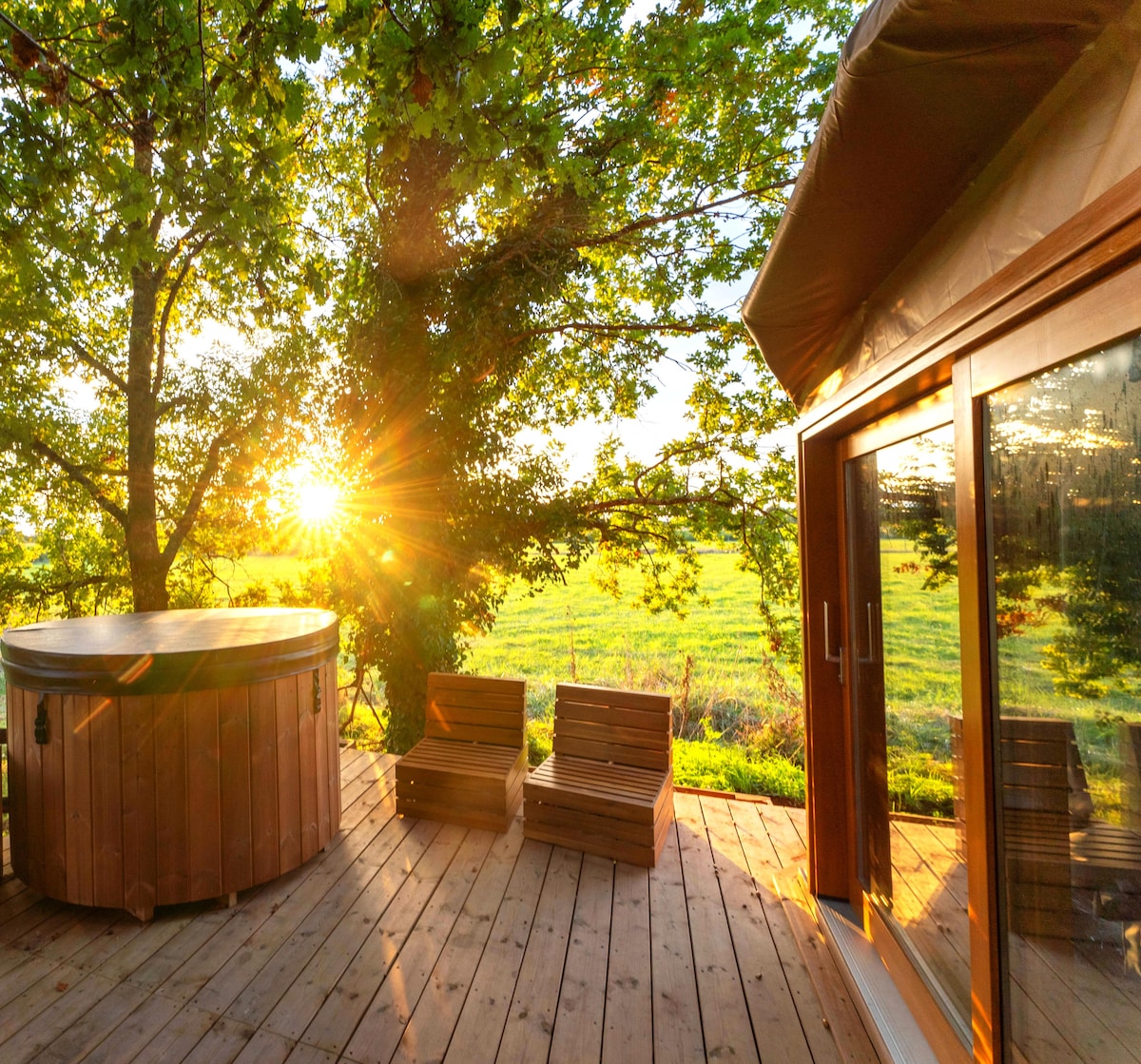 Si vous cherchez une nuit vraiment insolite au milieu de la nature, venez découvrir nos dômes géodésiques éco construits. Votre Dôme est sur pilotis avec une grande baie vitrée ouverte sur la nature, son poêle à bois, un accès direct à votre bain nordique sur la terrasse avec vue… Véritable bulle immersive éco-chic entourée de chênes, le Dôme haut de ses 4 mètres provoque un effet « waouh » dès que l’on ouvre la porte ! Pour une soirée glamour sans fausse note, votre petit déjeuner est inclus.