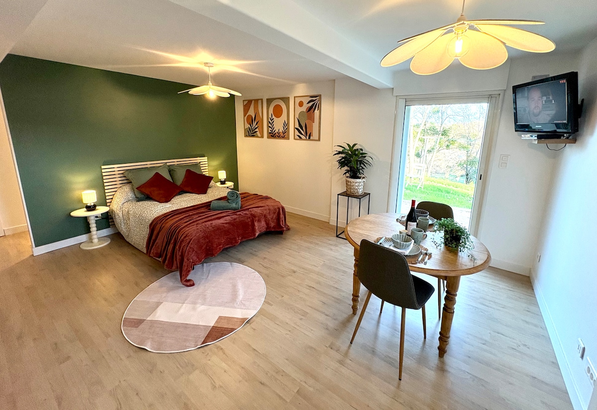 Détendez vous dans ce grand studio de plain pied unique et tranquille à deux pas de l'hippodrome et du golf de Montauban. Coté chambre lit 160x200 grand confort. Cuisine entièrement équipée. Coté salon un canapé avec grand écran. A l'extérieur un jardin privatif avec nécessaire pour déjeuner dehors et déguster des grillades. Place parking privée et protégée. Vous serez a la campagne et à 3 kilomètres du centre de Montauban. Idéal pour découvrir la région et profiter du bonheur de la nature.