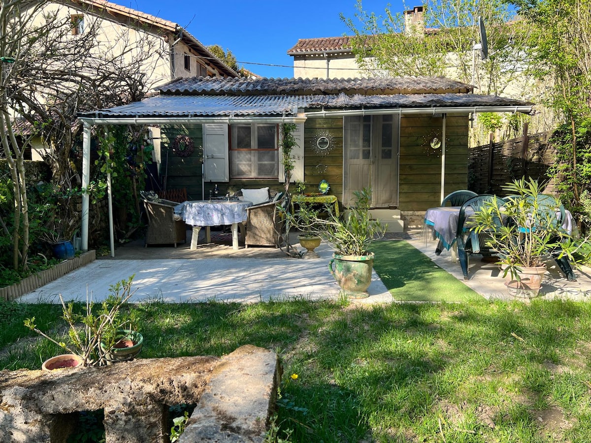 Petite maison de 20 m2 , en pleine campagne. Restaurée avec soin, elle comprend un séjour équipé d'un canapé lit 2 places, d'une kitchenette et d'une salle de bain chaleureuse type chalet. Elle dispose d'un poêle à bois. Elle profite d'un espace ombragé équipé d'un barbecue et d'un salon de jardin et d'un espace qui s'ouvre sur un large paysage de campagne. Un ruisseau longeant la praire, des chemins de randonnées et le village médiéval à proximité invitent à la balade .