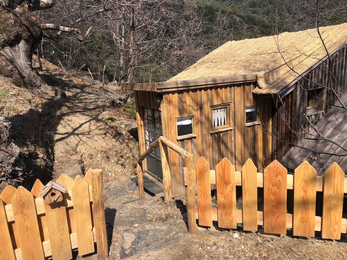 Unconventional accommodation in a green setting. You will hear the sound of birds and the song of the stream for a guaranteed rest with no other noises than those of nature. A romantic getaway as well for a cozy evening by the stove in winter or on a sunny terrace in summer. The rustic and minimalist aspects are also highlighted: dry toilets, reduced surfaces and layouts but executed with taste and simplicity.