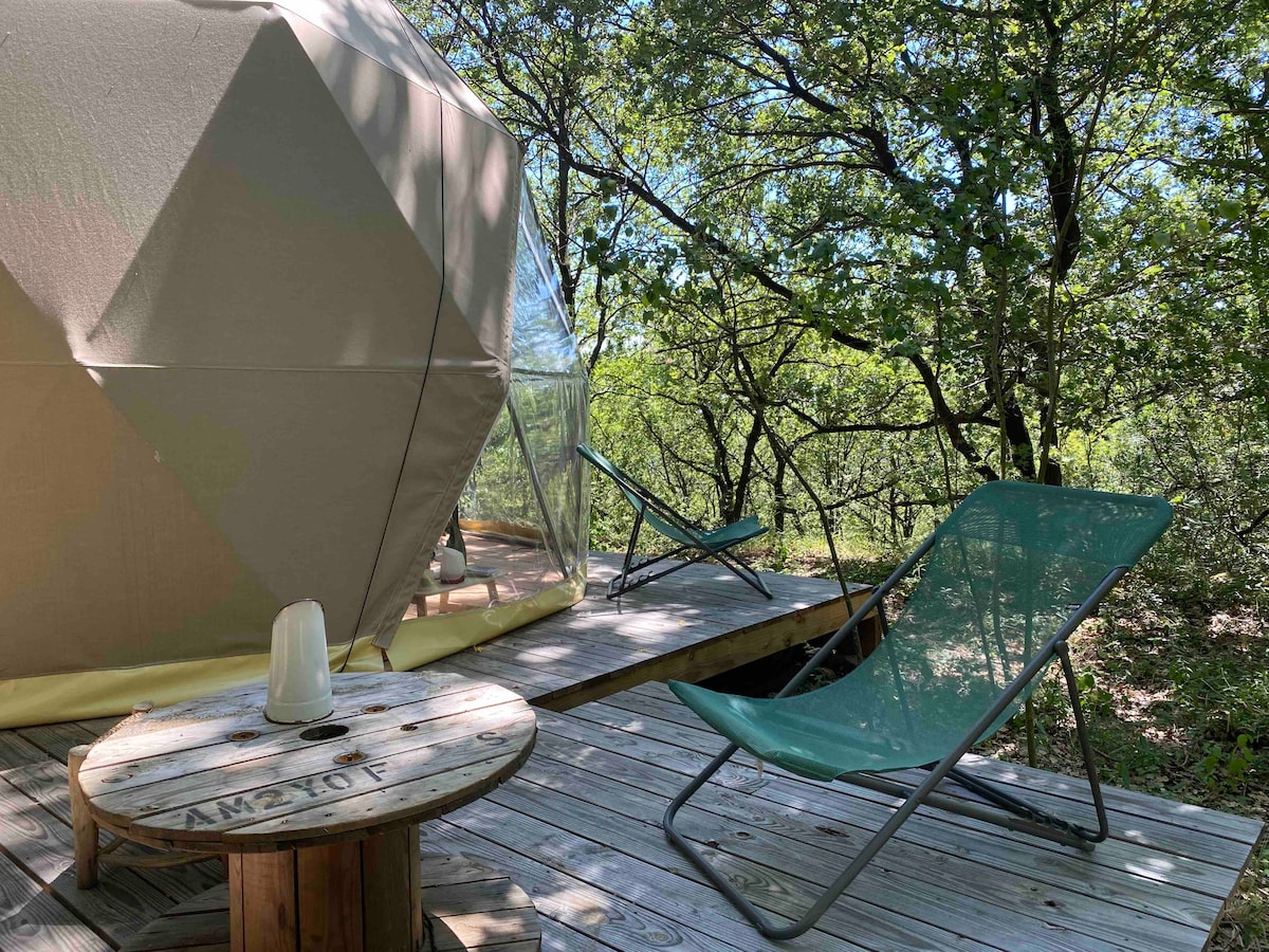 Entre les arbres, en osmose avec la nature, chaque dôme véritable cocon ouvert sur le bois , vous invite au repos . Terrasse attenante, table transats, coussins de méditation, livres . Toilettes sèches attenante ( en auto-gestion) Douche extérieure attenante. Espace repas sous les arbres. Hamacs . Au cœur des grands sites , Lodévois&Larzac , Gorges de l’Herault St Guilhem le désert ,Grand site Salagou cirque de Mourèze , Cirque de Navacelles La Couvertoirade . Baignade possible à