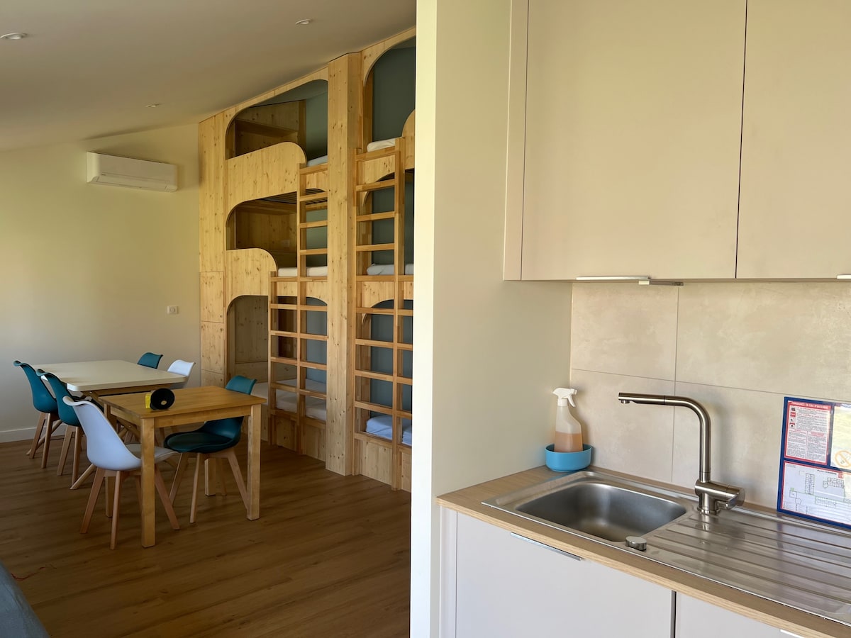 This 21m² space features a large queen-size bed (160x200 cm), a fully equipped kitchen with a coffee maker, microwave, induction stovetop, cooking utensils, and soap, high-speed Wi-Fi, a ceiling fan, private secure parking (free for short stays), and access to amenities like a gym, projection room, gaming studio, dining area, and garden.