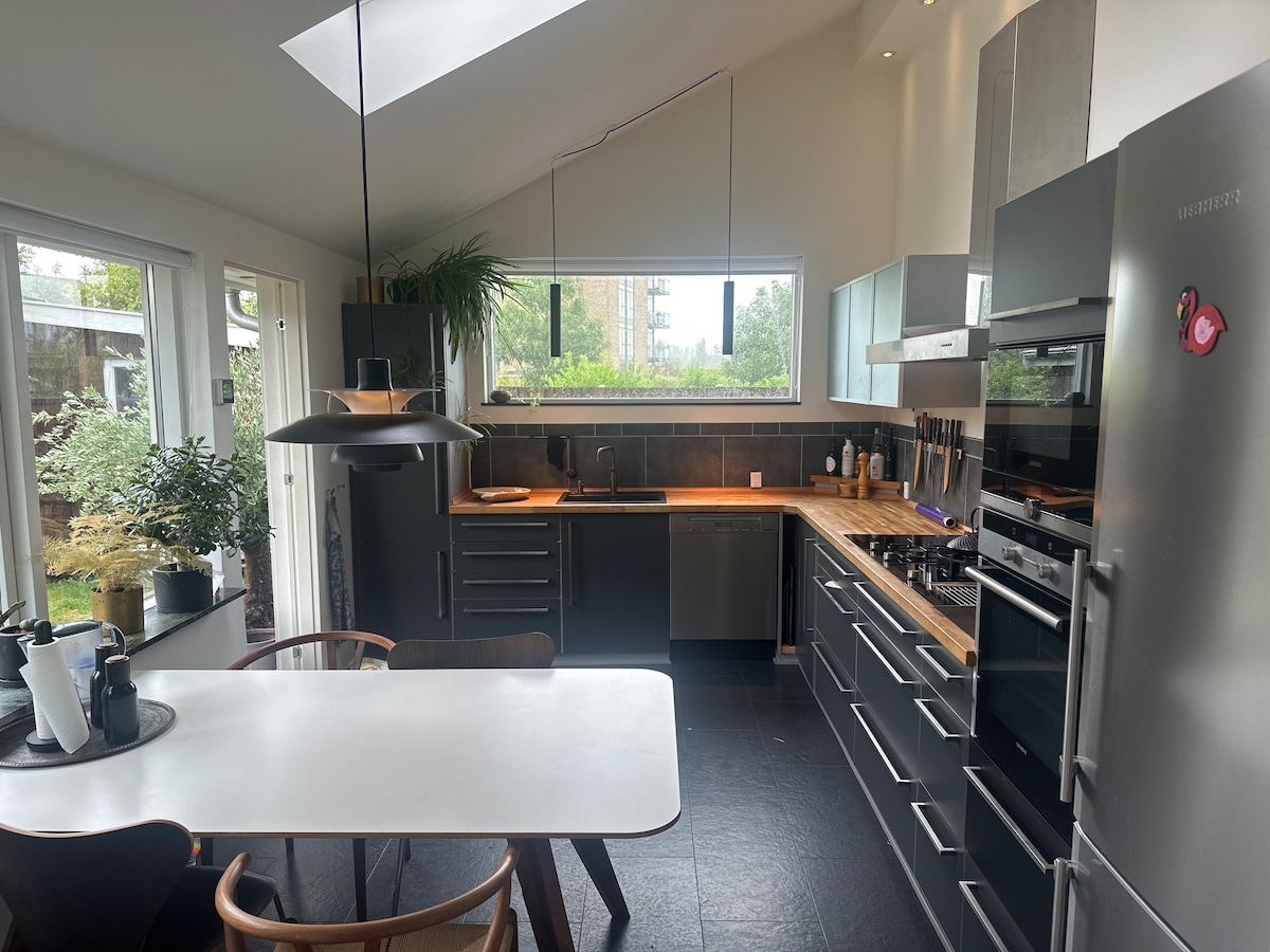 Architect-designed, newly renovated home with stunning nature view just a short bike ride from Copenhagen or the metro and a bus directly to the city center 300 meters from the house. Enjoy a bright kitchen/living space with terrace with eating area and furnitur, 3 bedrooms (2 double, 1 bunk beds), cozy lounge with sofa bed, playroom, 2 bathrooms (one with bathtub), and a laundry room. The private garden features a hot tub and access to scenic trails. For families and nature lovers. Free parking