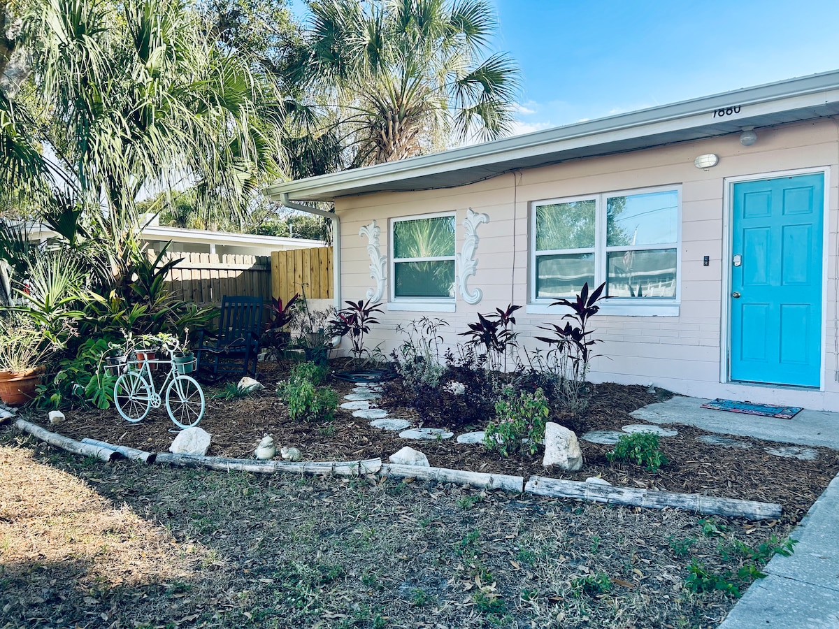 Vibrant 2BR/1Bath home sleeps 8 guests with a magical outdoor space designed to create beautiful memories! A tropical saltwater pool and large covered entertainment area complete with a TV—perfect for relaxing and enjoying a cocktail. The interior is colorfully curated to embody the essence of a vacation! Located just 5 minutes from the beach and 25 minutes to downtown. We have 16 Airbnb homes (family-owned and operated), and we're dedicated to finding the perfect fit for your getaway.