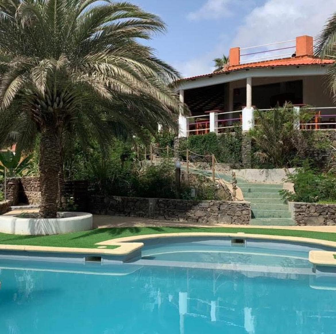 "VIAJANTE, verdadeiro jardim no coração de Tarrafal, frente a praça da cidade tem pátio interno cercado de 10 quartos e 4 suites em 3 pisos, com todo o conforto. O terraço sombreado e sossegado, situa-se no último piso, oferece uma luminosidade magnífica e um panorama de 360° com as praias, as serras, o Monte Graciosa, paisagens excecionais que a localização oferece. Os espaços reservados à restauração e ao relaxamento facilitam os encontros e o bem-estar, sempre cercados de plantas e flores."