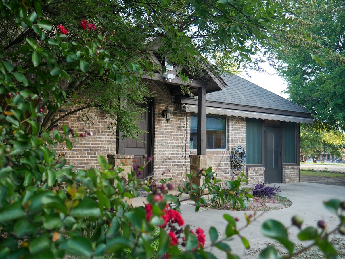 **Updated cleaning procedures to meet/exceed CDC recommendations** Settle in for a stay at our hideaway. This private guest house is nestled in a grove of old oak trees, sitting above our detached garage. We renovated top to bottom and relax in our large outdoor space. This quiet guest home can accommodate up to 6 people. The best part? We are 5 minutes from Downtown FtW and centrally located in Tarrant County. 20 minutes to get anywhere, including DFW airport, AT&T stadium and TX Rangers