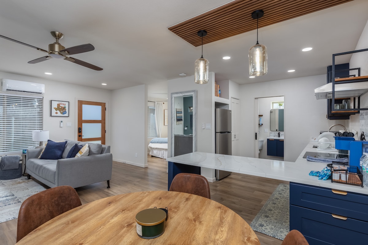 NEW CONSTRUCTION 300sf private guest house! KING BED. Vaulted ceilings, tv, kitchenette with a table to work or eat at, refrigerator, sink, microwave, air fryer & coffee bar. There’s a spacious bathroom with walk in shower! Fast WiFi and plenty of closet/drawer space. Perfect getaway close to the hospital district, TCU, stockyards, Fort Worth Zoo & amazing restaurants. HVAC system includes a REME HALO® to reduce viruses including SARS-CoV-2 virus causing COVID-19. This space is for 2 people max.