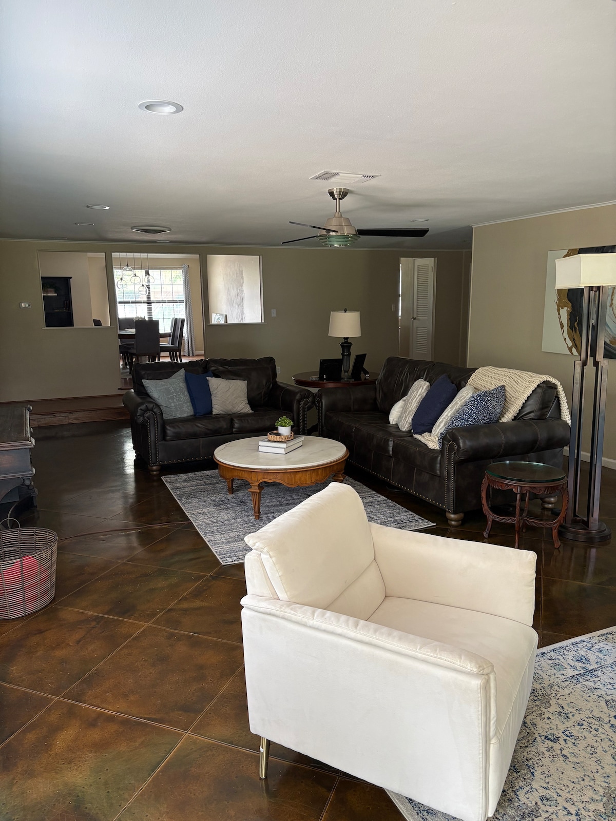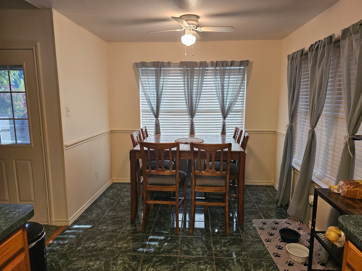 -Feel relaxed in this Beautifully Renovated Texan Modern-farmhouse home with an Open Concept Living & Dining Area. With beds: 2 Kings 2 Queens, and 2 full sized futon. *We offer fully furnished long term lease for Corporate/Relocations/Personal/Min 30-day Booking!* Located near Stockyards, FTW Nature Center, Museums, Water Parks, 3 Minute Drive from Lake and Parks. Perfect for families, traveling professionals, and fishermen! If you're looking for a Unique Stay Experience, you've found it!