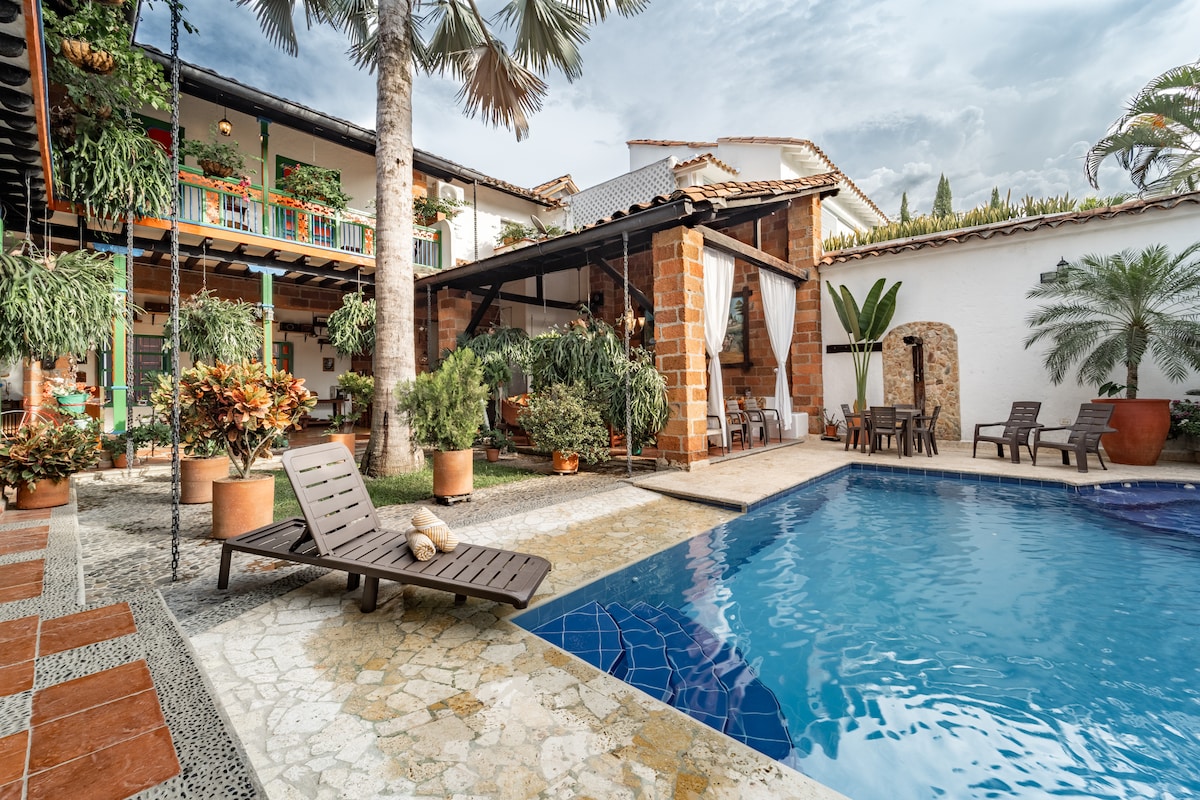 Hermosa casa colonial Antioqueña, con piscina privada en la única unidad temática del país. Cuenta con el privilegio de disfrutar de calles empedradas que sumergen al visitante en la época de la colonización, donde entre el verde de las montañas y las caudalosas aguas del río Cauca se encuentran casas pintorescas, fondas de época y hermosos jardines. La tarifa incluye la señora encargada del aseo que colabora con la preparación de alimentos ( 8 am a 3 pm).