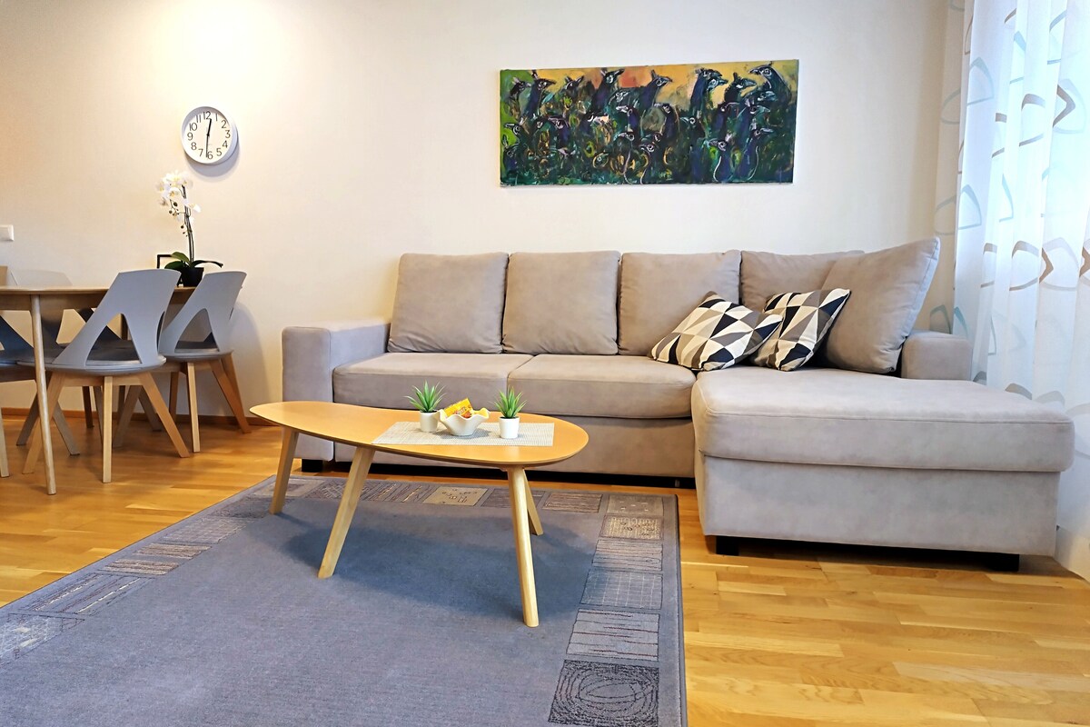 Bright apartment in the city center, within walking distance to the Town Hall Square. It has large balcony with a couch where to enjoy sunshine with a cup of coffee or tea. Bus station is 7 minutes and railway station 12 minutes of walking, free parking (with permit) in front of the house. Nearest shopping mall is 5 minutes on foot. Apartment has all comforts, including washing machine, bath, dishwasher, air conditioner, coffee machine and WIFI.