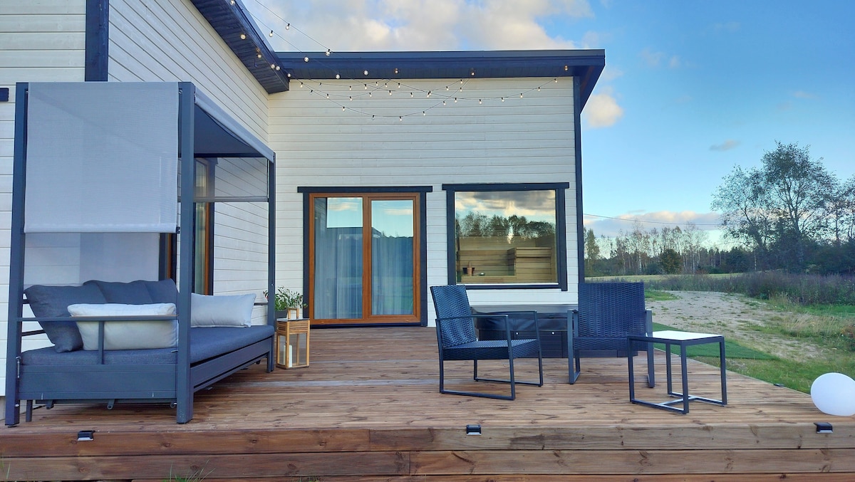 In this peaceful and stylish place you can relax and enjoy the hot water in the hot tub (additional fee, 1 night upon reservation), relax in the warm sauna (additional fee), grill meat and enjoy morning coffee on the terrace. Come and celebrate your big and small events in the company of your loved ones or surprise your loved one with a romantic evening. To spend time, you can use our Viking-themed grill house (additional fee) .