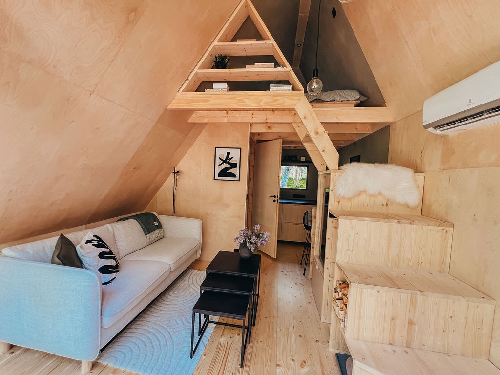 2-korruseline, avatud planeeringuga, väike majake. Üleval- magamiskohad 4-le. (2 madratsit) All- lahtikäiv diivan- 2 in. Külmkapp, 2-kohaline induktsioonpliit, küpsetusahi, nõudepesumasin, kamin- puuküte, õhksoojuspump. Ka talvel maja soe. Dušš+ vannitoas põrandaküte. Terrass. Tünnisaun- 70€ extra. Grill- kaasa võtta süsi, muu olemas. Lastele mänguväljak, batuut, kiigud, trosslaskumine, mängumaja, hoov jooksmiseks. Meil on väike koer, miniküülik, kanad. Pererahvas elab kõrval majas.