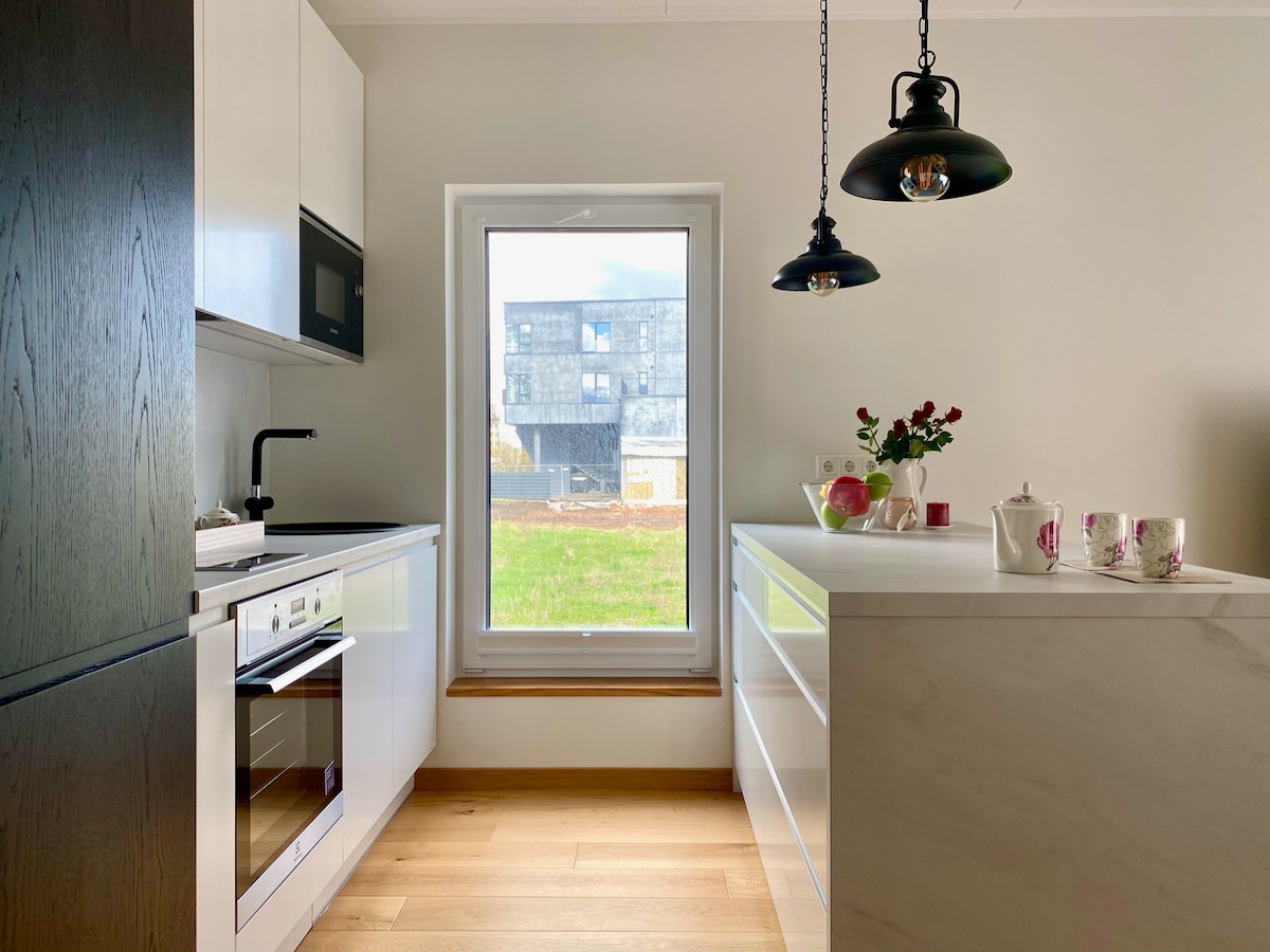 Tasteful 2-room apartment located in the brand new development on the 6th floor offering beautiful views of the river. Free parking in front of the house. A large grocery store is just a two-minute walk away, the city center a 5-minute drive away. Ideal location if you want to be close to the city centre, but a little away from the hustle and bustle of the city. The apartment also has all the little amenities: from a coffee machine to a hairdryer. Come visit and you'll never want to leave!