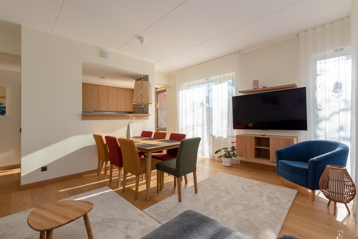 98 m² • 4BR • Sleeps 7 (1 king + 2 queens + 1 single) Private sauna • 9 min to city centre Modern oak interiors • 1th floor with elevator access 2 bathrooms (shower + sauna + double sinks + second toilet) Workspace in master bedroom and single bedroom. Secure garage parking • Smart-lock check-in Full kitchen • Dishwasher • Coffee maker Washer + dryer in-unit 65" TV (Netflix + Disney+) Quiet hours: 23:00–07:00 No smoking • Pets on request Check-in 14:00 • Check-out 12:00