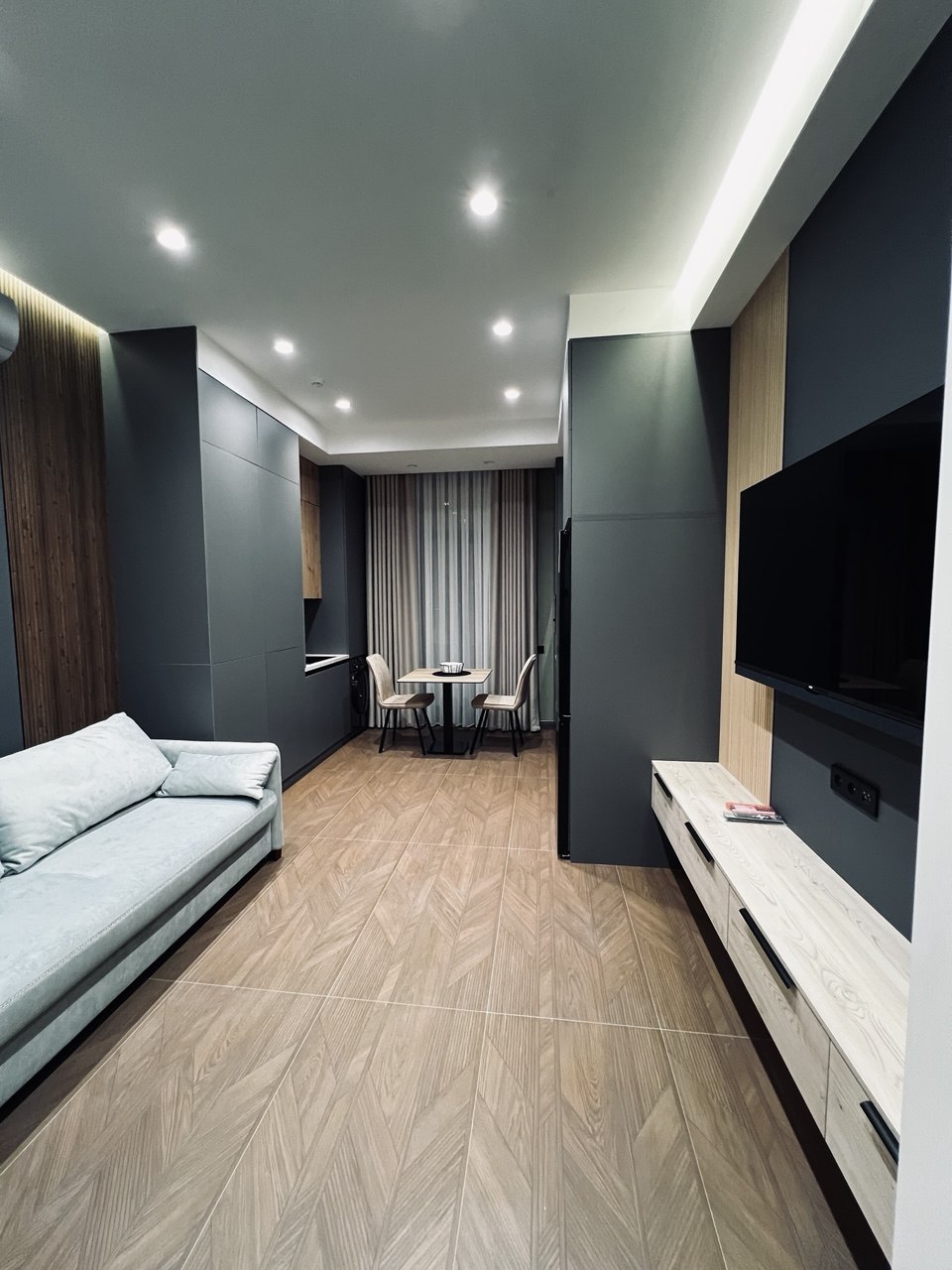 Modern 1-bedroom studio in central C1, next to Fresh Cafe. Ideal for couples, small families, and business travelers. Features a separate bedroom, living area, equipped kitchen, and bathroom. Includes WiFi, AC, and washing machine. Located on the 2nd floor (no elevator). Quiet courtyard with green area and playground. Walking distance to cafes, shops, and city center.