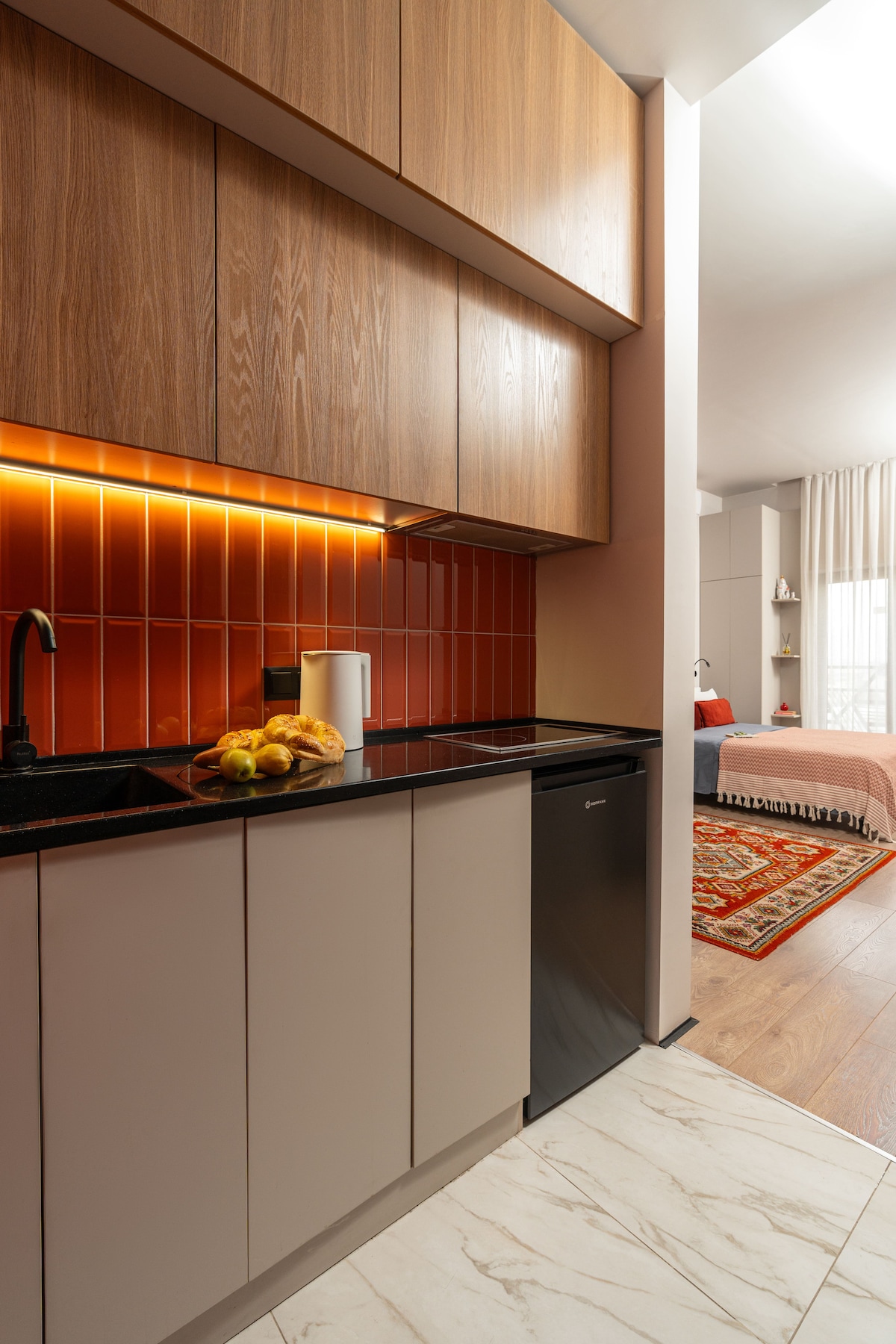 Окунитесь в атмосферу дизайнерских апартаментов премиум-класса в сердце Ташкента. Гостиная с диваном bouclé, стильной мебелью и журнальными столами из мрамора создаёт ощущение отеля 5. В квартире две спальни: мастер-спальня с большой кроватью, и вторая спальня с двумя отдельными кроватями — идеальна для семьи, друзей или коллег. Гардеробная с подсветкой, полностью оборудованная кухня, ванная в стиле boutique hotel. Идеально для гостей, которые ценят комфорт, эстетику и высокий уровень сервиса.