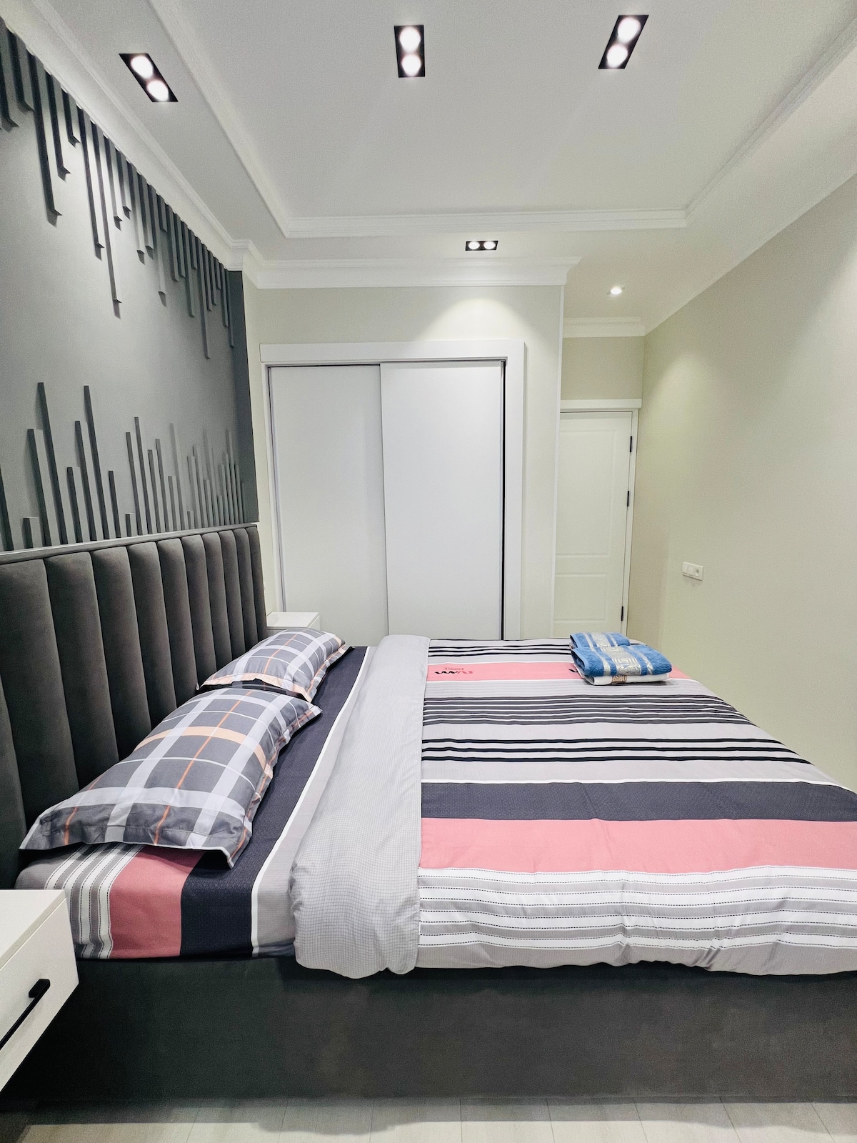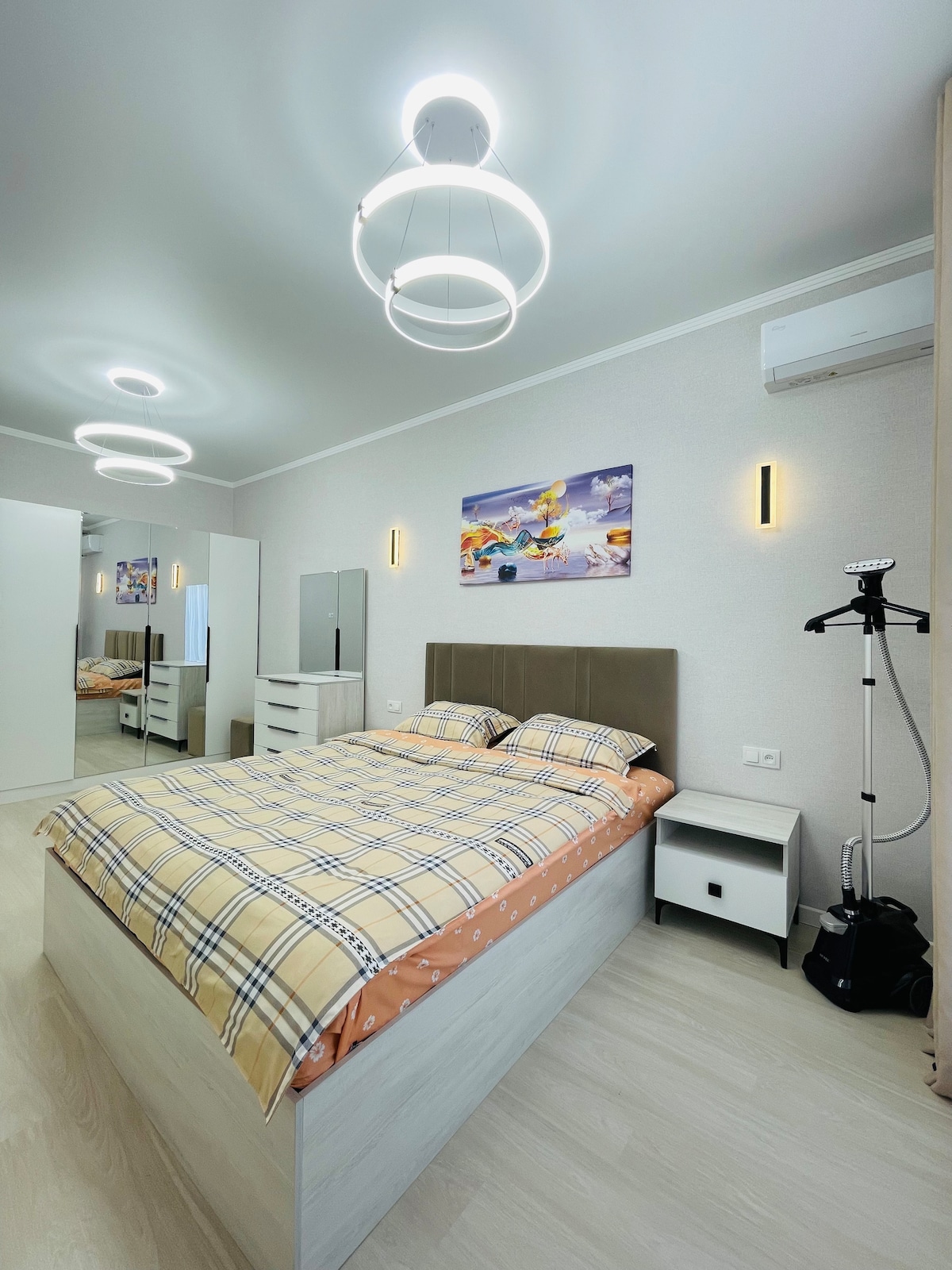 Beautiful modern renovated Canadian style unit. Comes with: - 90’ TV amazing for movie theatre experience - Full Sonos sound for amazing time while watching movie - Massive kitchen to cook - Location is 2 min away where president of Uzbekistan lives, means its a good and secure area - Down side is - its 20 min away from downtown/centre of the city - Has security camera outside of the Unit - Taxi really cheap in this area and easy to find by using Local Taxi Application on your phone
