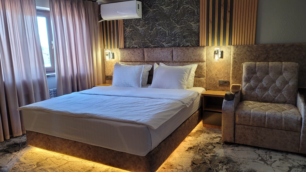 Стандартный двухместный номер с 1 кроватью. Двухместный номер с 1 кроватью, кондиционером, телевизором с плоским экраном и потоковыми сервисами, звуконепроницаемыми стенами, принадлежностями для чая/кофе, гостиным уголком, а также видом на город. В номере одна большая кровать.