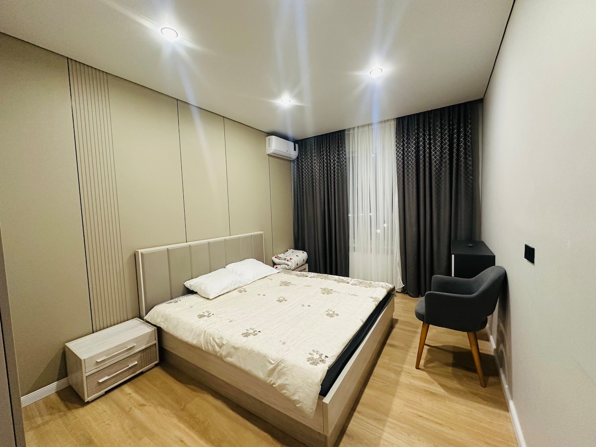 Welcome to your elegant city escape — a brand-new, beautifully designed apartment located in the city centre just steps away from Tashkent ‘s main attractions. 🍳 Fully Equipped Kitchen • Modern appliances: oven, stove, fridge, kettle, and essential cookware. 🛏️ Bedrooms • 2 rooms with premium bedding. master bedroom with make up - desktop station • Twin room with a walk-in closet • Fresh towels and toiletries provided. 🌅 Balcony with City Views overlooking Tashkent’s skyline and greenery.