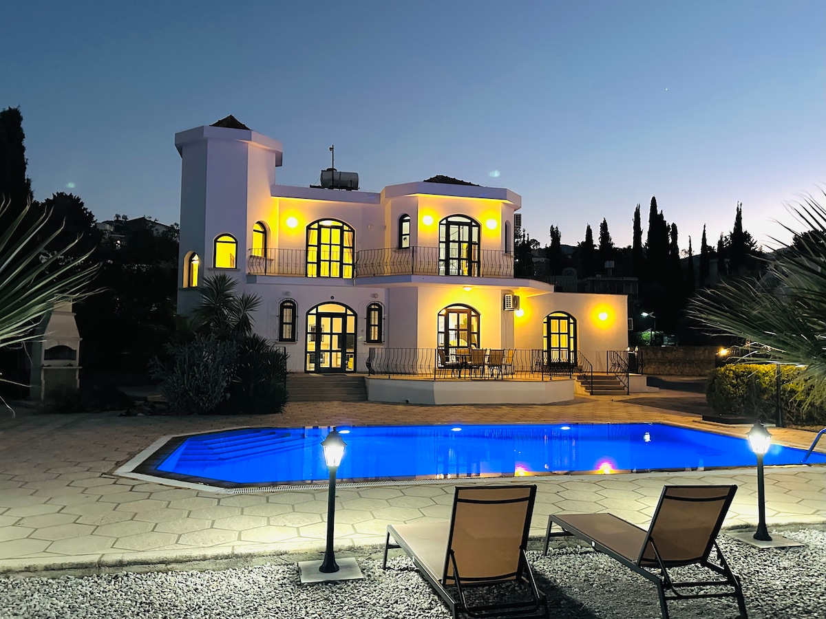 Peaceful Mountain Villa Escape to this serene 3 bedroom villa with a large pool and stunning views of the mountains, sea, and surrounding landscapes. Perfect for family and friends, it sleeps up to 5 guests and includes welcome gifts of wine, beers, and snacks. Located just 10 minutes from Kyrenia city center, and close to casinos, beaches, and restaurants, this peaceful retreat offers both convenience and tranquility. Airport Transfer and Car hire is also available for easy travel planning!
