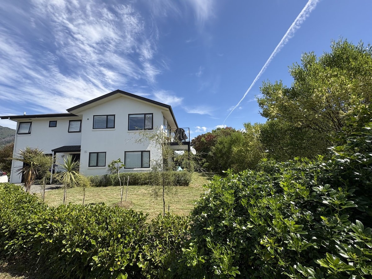 Welcome to Mapua - drive sloped but suitable for optional motor home parking at top + 2 x cars. shade sail up - please advise early if you need shade sail taken down for higher vehicles. Additional king bed in sleepout avail on inquiry extra price - daughter does early 5:30 shifts some mornings if you hear her. She’ll try and be quiet! Kitten Arthur loves to venture across the roof to our upstairs window if you hear a pitter patter or thud on roof.