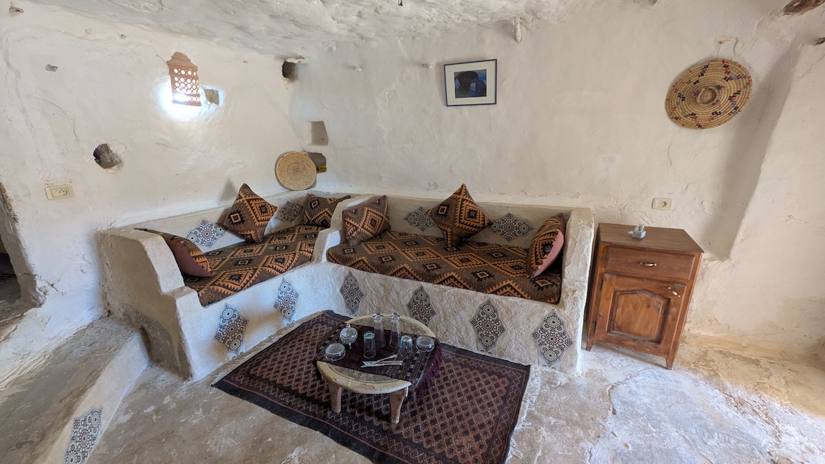 cette grotte troglodyte âgée de 2400 ans entièrement retapée et sécurisée est un véritable monument historique et un témoin vivant des vertiges des Berbères d'afrique. située au sommet du mont Douiret qui donne son nom au village, ce logement offre une expérience unique de pureté, méditation bien être et évasion. je suis sur place durant le séjour afin de concocter repas, guider les escapades en vallées et montagnes. cette expérience est non seulement unique mais très riche.