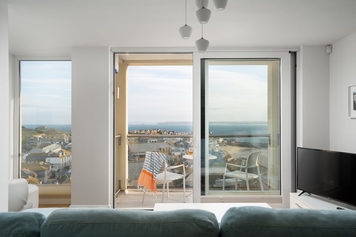 This luxury studio apartment has some of the most breathtaking views of St. Ives harbour, bay and beaches. Located in one of St. Ives oldest buildings in the heart of St. Ives, this modern apartment was designed to keep some features of the original building, whilst making most of the stunning views, whether lounging on the sofa, eating at the breakfast bar, or lay in the comfy bed.