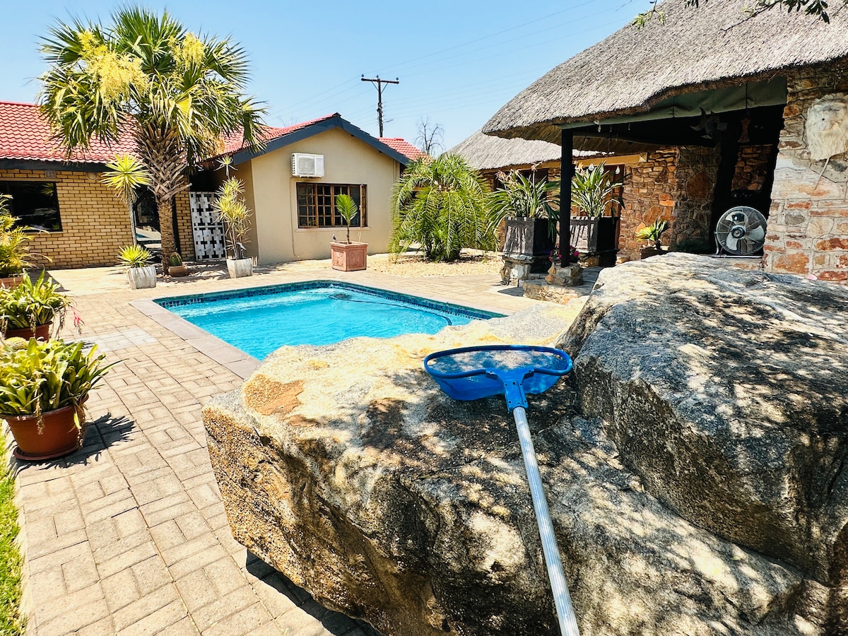 The Rustic Chalet is a large and very private accomodation. Pefect for holidaying in for a couple, 3 friends or family of 3 people. The chalet is set in a pool front with view of the greenery, trees and some rocks. Our room is a traditional chalet exclusively furnished , a king bed, lounge setup, fridge, microwave, sleeper couch, ensuite bathroom, WIFI, AC, DSTV and other utilities. Guests have access to a beautifully set gazebo overlooking a swimming pool and a dense tree canopy.