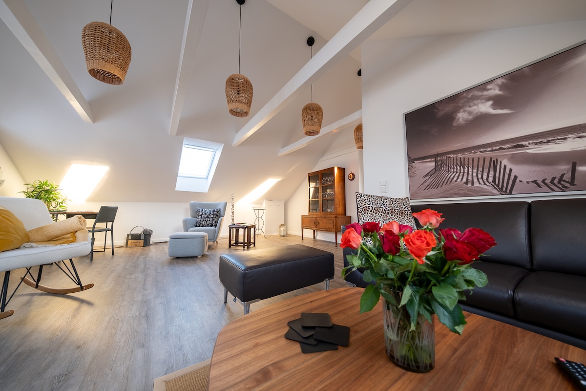 Liebevoll und durchdacht haben wir mit ganz viel Herzblut eine traumhafte Ferienwohnung auf 70 qm für 2 ( bis 4) Personen auf 2 Ebenen geschaffen- im lichtdurchfluteten Obergeschoss befindet sich der Schlafbereich. Bitte beachte, dass die einzige Tür die Badezimmertür ist- der Rest ist offen. Wir haben versucht möglichst nachhaltig, ökologisch und hochwertig zu bauen - die Farben sind von Kreidezeit, die Lacke auf Wasserbasis.