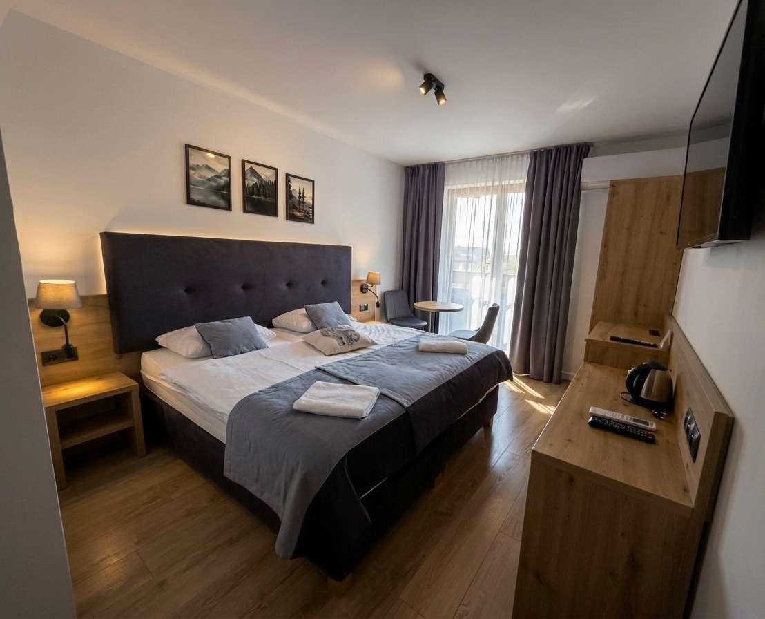 Klimatyzowany, piękny apartament urozmaicony widokami Polskich Tatr. Wyposażony aneks kuchenny, łazienka, przestronny salon oraz sypialnia z wygodnym łóżkiem pozwolą na wypoczynek po górskich zdobyczach. W apartamencie znajduje się również kominek.