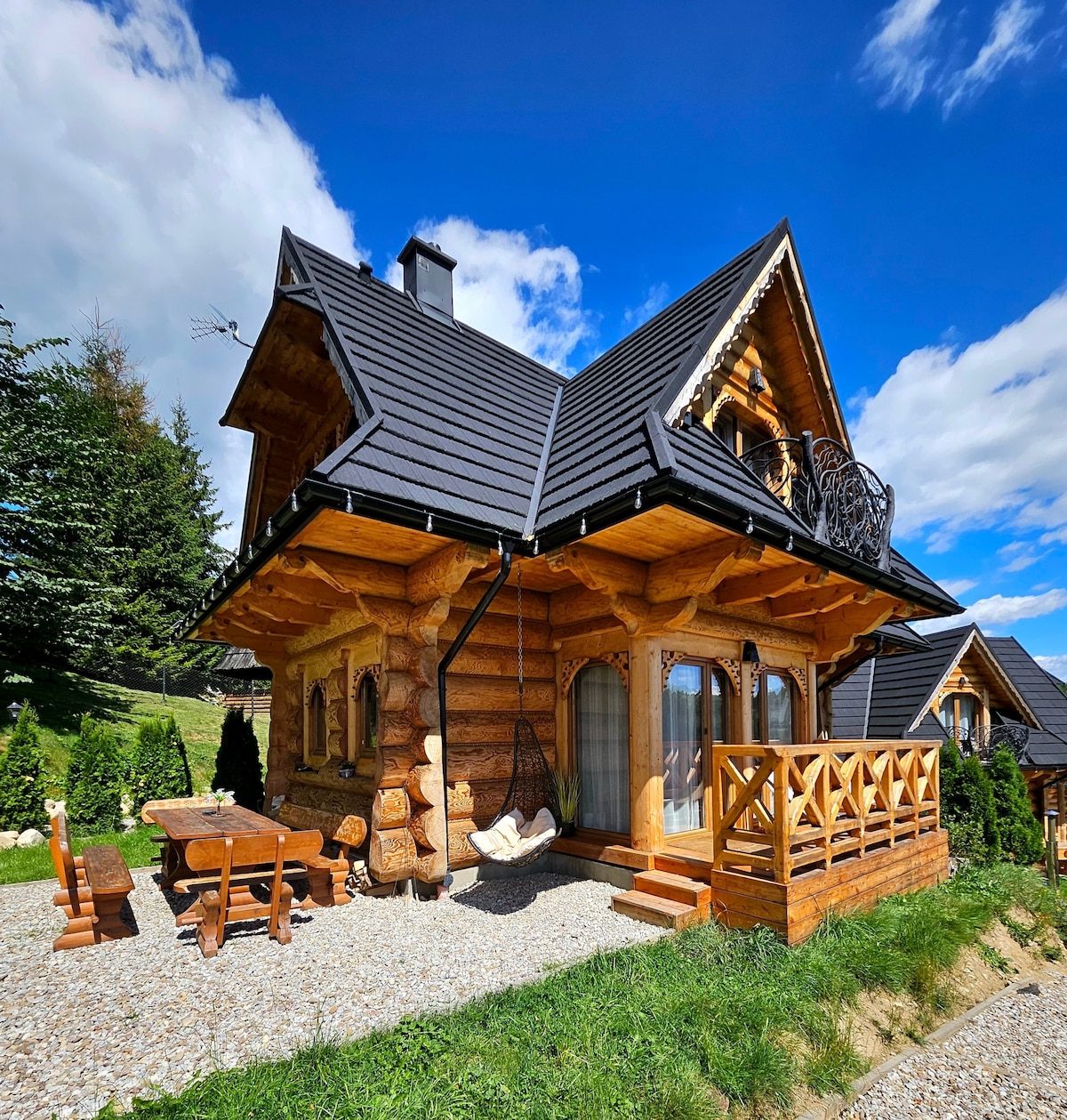 Klimatyczny domek w sercu Podhala w miejscowości Czerwienne, blisko okolicznych term oraz ścieżek rowerowych. Domek zbudowany z drewna z elementami tradycyjnej góralskiej sztuki. Widok z niego zapiera dech w piersiach. Poranna kawa na tarasie z widokiem na góry, lasy, pasące się na łąkach owce, cieszą oko. W naszym domku można zorganizować rodzinne biesiady przy kominku, spędzić czas na czytaniu ulubionej książki. Bliskość lasu , miejsce na spacery , cisza i spokój , miejsce to jest idealne .