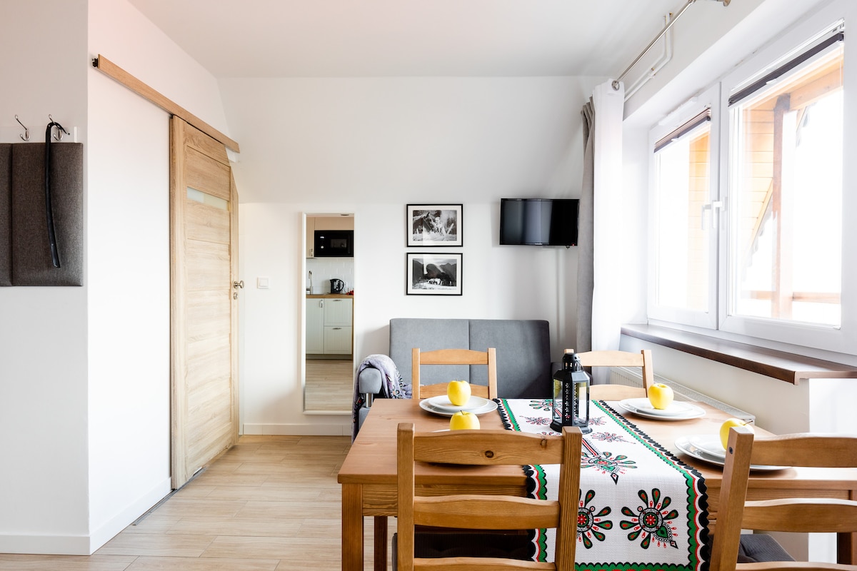 The Szarotka/Krokus apartment is a cozy 27 m² studio, perfect for 2 people or a couple with a child. It features a kitchenette, a bathroom with a shower and washing machine, and a spacious balcony with a view of the Tatra Mountains. Guests of the apartment also have access to the SPA area, providing relaxation and comfort during their stay.
