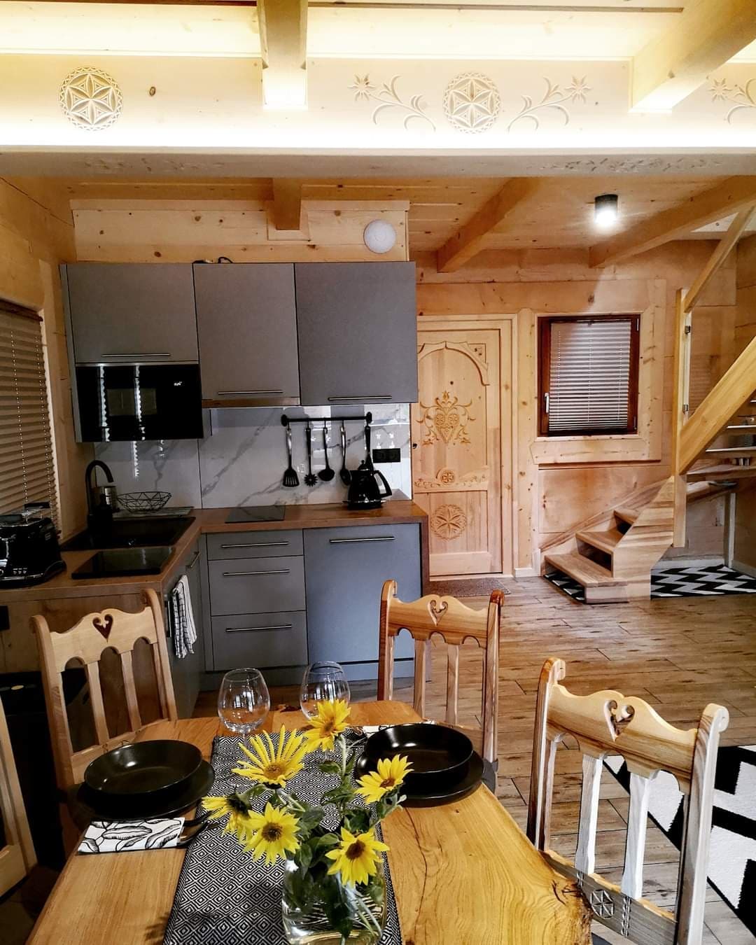 Drewniany domek góralski, 8 osobowy z pełnym węzłem sanitarnym ( łazienki z prysznicem, umywalką i ubikacją), z zapleczem kuchennym (kuchnia elektryczna, mikrofalówka, czajnik elektryczny, lodówka, naczynia i sztućce). Jeden z 2 bliźniaczych domków. Łazienka oraz kuchnia po generalnym remoncie w 2025.