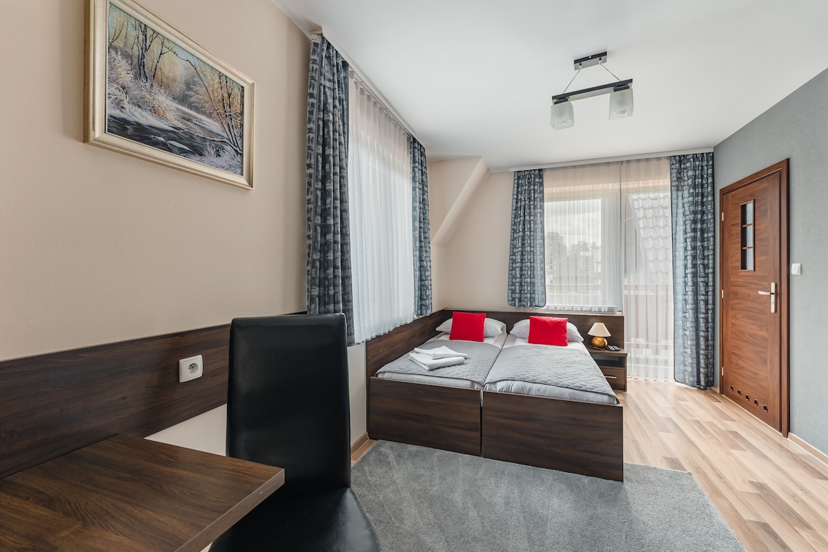Idealne miejsce dla rodzin – położone w centrum. W naszej ofercie znajdą Państwo nowocześnie i elegancko urządzone pokoje 2, 3 i 4 osobowe z balkonami, łazienkami, TV, dostępem do Internetu, aneksu kuchennego (= dwupalnikowa płyta indukcyjna, kuchenka mikrofalowa, lodówka, czajnik elektryczny, sztućce, naczynia) oraz przechowalnią sprzętu narciarskiego. Ponadto na terenie obiektu znajduje się duży ogród z placem zabaw dla najmłodszych oraz parking dla samochodów osobowych.