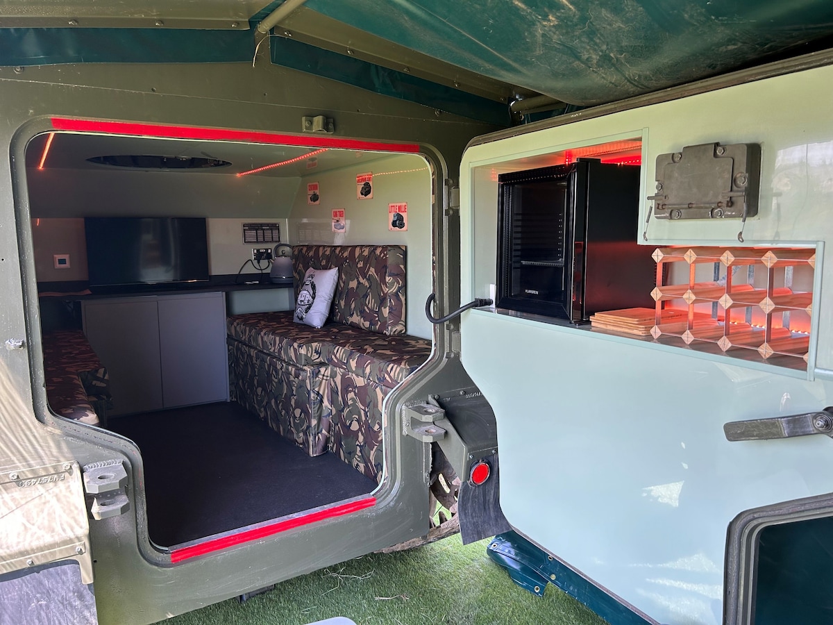 Our Samaritan tank is an ex military vehicle that has been converted into a glamping pod to sleep 2 people. Other accommodation is available to book in conjunction if there are more than 2 people in the party. Pets welcome at a charge of £20 per pet, please note that pets may need to be lifted into the accommodation.