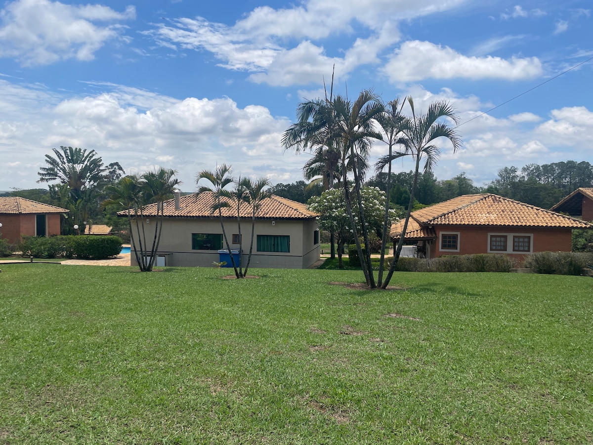 Paisagem lindíssima no campo, passar uns dias e longe de poluição....recuperar a energia.... Temos disponibilidade de até 3 suites, espaço amplo aberto, cozinha externa próxima da área gourmet, mesas para jantar... Lagos para Pesca e um gramado imenso para sua diversão com campo de football! Estamos fechando um grupo por vez na área secundaria que dá p/piscina. *Músicos Welcome: palco disponível *Pode se assar costela, churrasco * Não disponibilizamos roupas de cama, nem banho