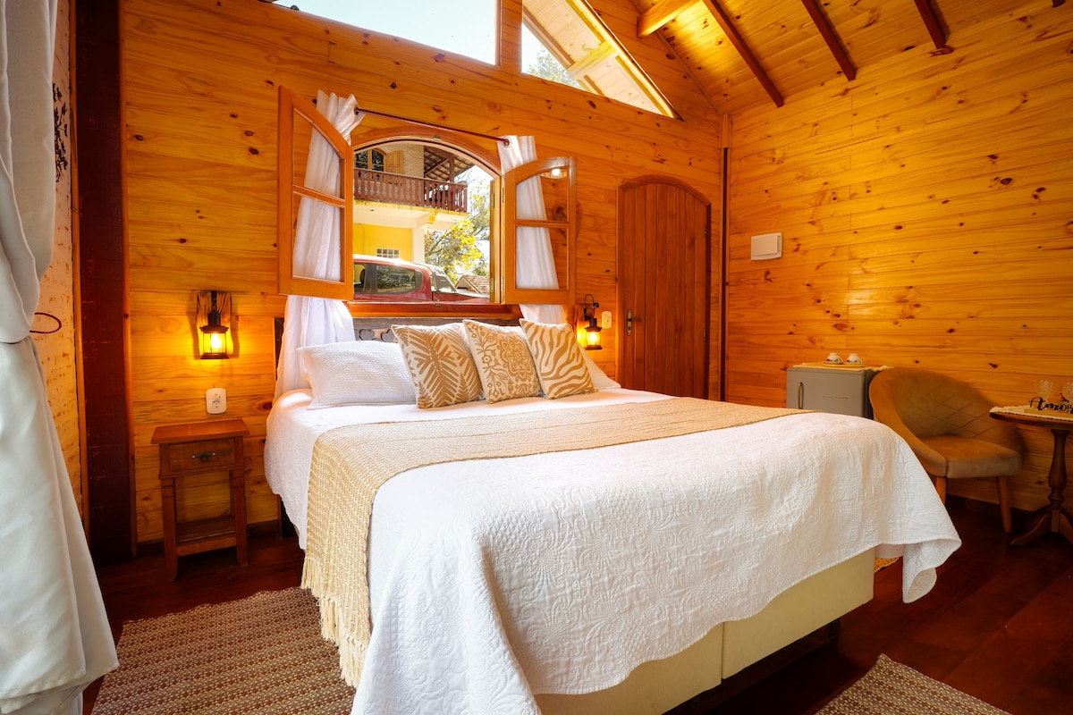 Chalés Estância Verdejante 🍃 O Chalé Névoa da Montanha é o refúgio ideal para casais em busca de momentos românticos e inesquecíveis. Com sua vista deslumbrante para a natureza, proporciona um ambiente privativo e acolhedor, perfeito para relaxar e desfrutar da companhia um do outro. Ideal para quem deseja fugir da rotina e se perder na beleza da montanha. Com cozinha inclusa, proporciona flexibilidade para preparar suas próprias refeições. Venha desfrutar lindos momentos em meio à natureza! ♥️
