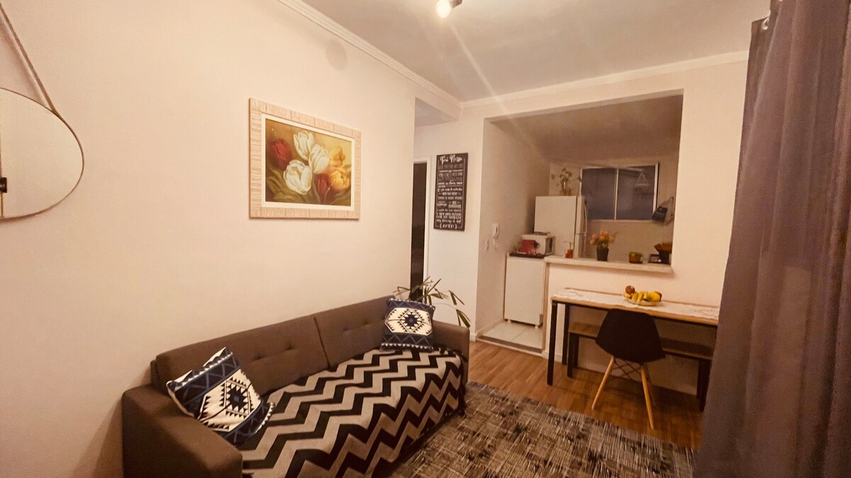 Espaço seguro, limpo, c/ cozinha completa, sala de jantar, microondas, fogão, filtro agua 3 temperaturas, panela elétrica arroz, liquidificador, sanduicheira, processador de alimentos, geladeira, sala c/ tv,wifi em td apto,quartos arejados, ventilador de teto.Segurança 24hs garagem. P/ hospedagens + longas que uma semana é possivel fazer limpeza e a troca de toalhas e roupa de cama c/ pagamento a parte de taxa. Excelente localização com padaria, supermercados, farmacia, restaurante próximos