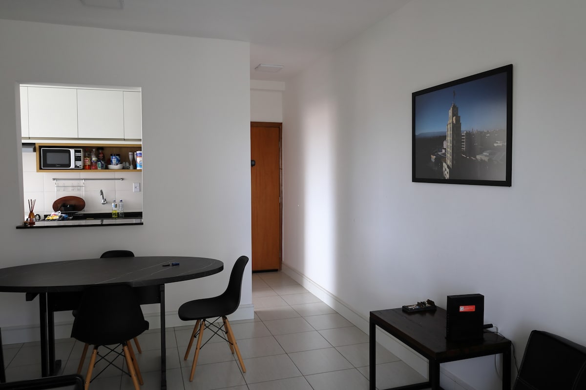 Perto de o centro da cidade e a 4, 6 km (10 minutos de Uber) da rodoviária de Taubaté.. Ótimo p/ viagem de negócios, estudantes universitários ou para quem queira conhecer Campos do Jordão, Aparecida, São Luiz do Paraitinga e a região do Vale do Paraiba. Equipado com 1 cama box solteiro na suíte, 1 cama box solteiro no quarto e 1 sofá-cama (de casal) na sala. No total, 2 banheiros. Equipado com microondas, geladeira, ar condicionado. 2 vagas cobertas de garagem