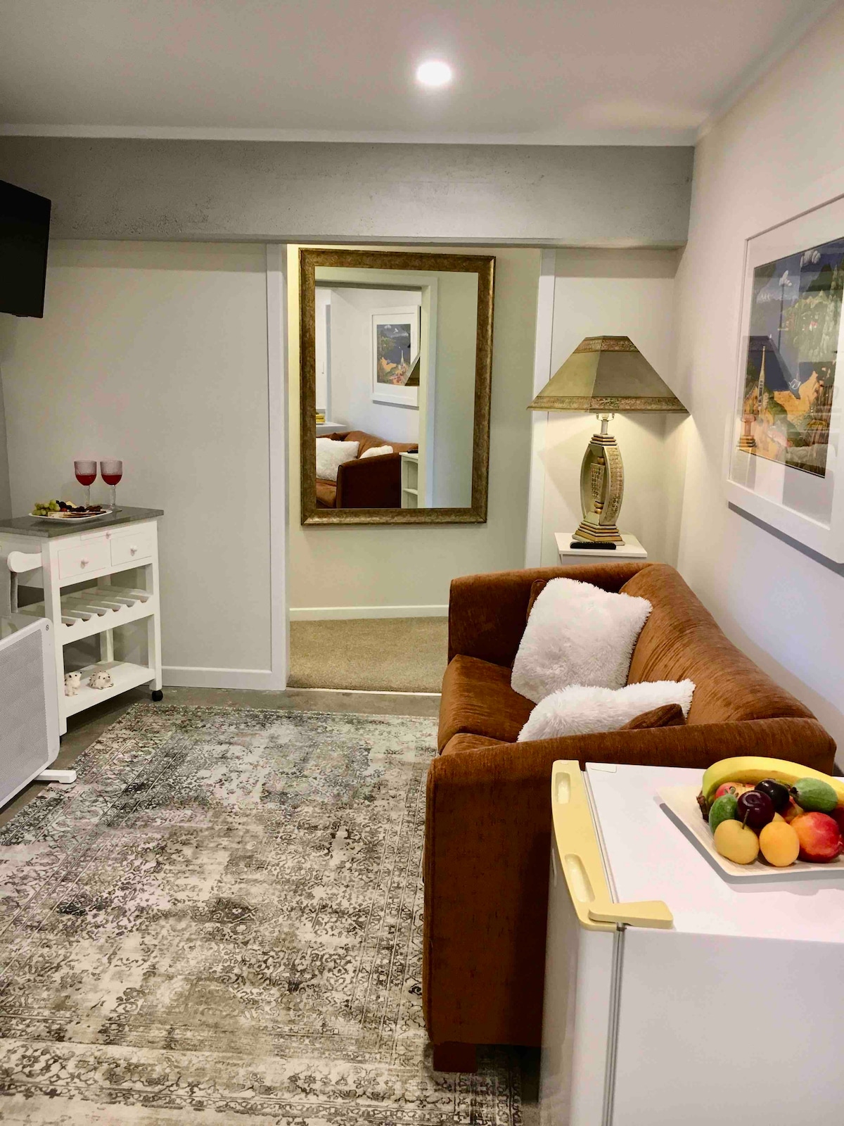 Kick back and relax in this calm, stylish space. The view across the lake to Acacia Bay will keep you mesmerized. Entrance through a ranch slider from your own north facing deck. Private access is available to the Botanical Gardens where mature native trees provide a lush canopy covering breathtaking walks before you settle in with a glass of wine on your own deck watching the lake and listening to all the bird life. Included is separate bedroom with a queen bed, a modern tiled bathroom, smarttv