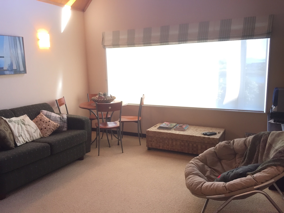 This is a pretty little light & sunny, self contained unit. Ideal for couples but we could add a portacot. 2 mins walk to the lake for swimming, 20 minutes easy walk to town. Basic accommodation, with tiny bathroom - shower toilet & little basin. Kitchen suitable for coffee toast etc with a microwave. SMART TV for Netflix. Gorgeous view of marina. Breakfast supplies including muesli, fruit, yoghurt, bread for toast. Fiber B/Band. Not fancy accommodation. Good quality linen and comfortable bed.
