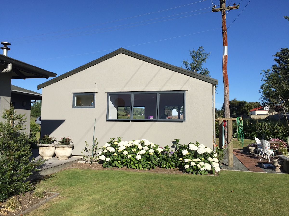 Semi detached sunny compact studio joined to main dwelling by deck located on our lifestyle section. Studio has a deck divided from the main dwelling by a screen for privacy. Private entrance/lock box. Kitchenette, continental breakfast provisions on first morning supplied - microwave available (no stove top or oven) . Samsung Smart TV (Freeview TVNZ+ etc), you will require your own subscription for streaming services. Off street park. You will need a car as there is no public transport.