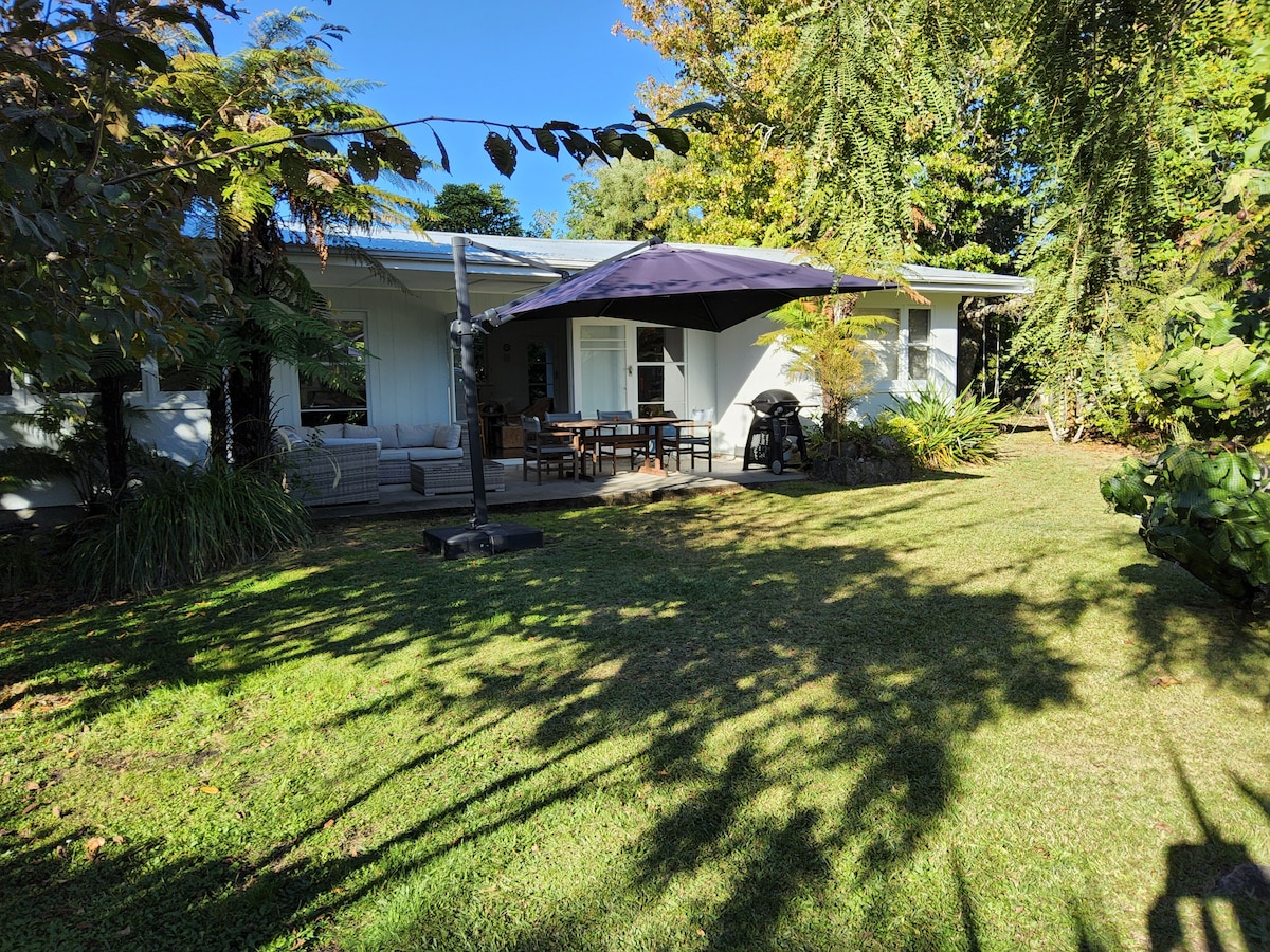 Fabulous Garden & Outdoor bath. 15 minute walk to town & Lake. 5 Star Reviews from over 600 guests Ideal for Couples • Covered courtyard, large outdoor chandelier & dining area • Outdoor cast iron bath . Enchanting shared garden, veggies, fluffy chickens, fruit trees . Well equipped kitchen and washing machine • Kayak available • Free unlimited Wifi . Covered off street parking . Easy access to Taupō's many attractions . Muesli and milk provided for breakfast