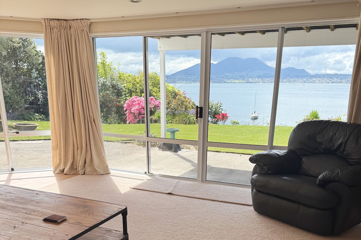 Location!!Location!!Location!! Our house has extensive, close stunning lake views, only 8 minutes (7 kms) drive into Taupo town. A car is necessary as we’re NOT in town! Clean, comfortable, private, peaceful 3 bedroom house surrounded by trees and bush and not in busy suburbia. Sleeps 5. Just across the road from the lake and 2 Bays. We’ve had many return guests.