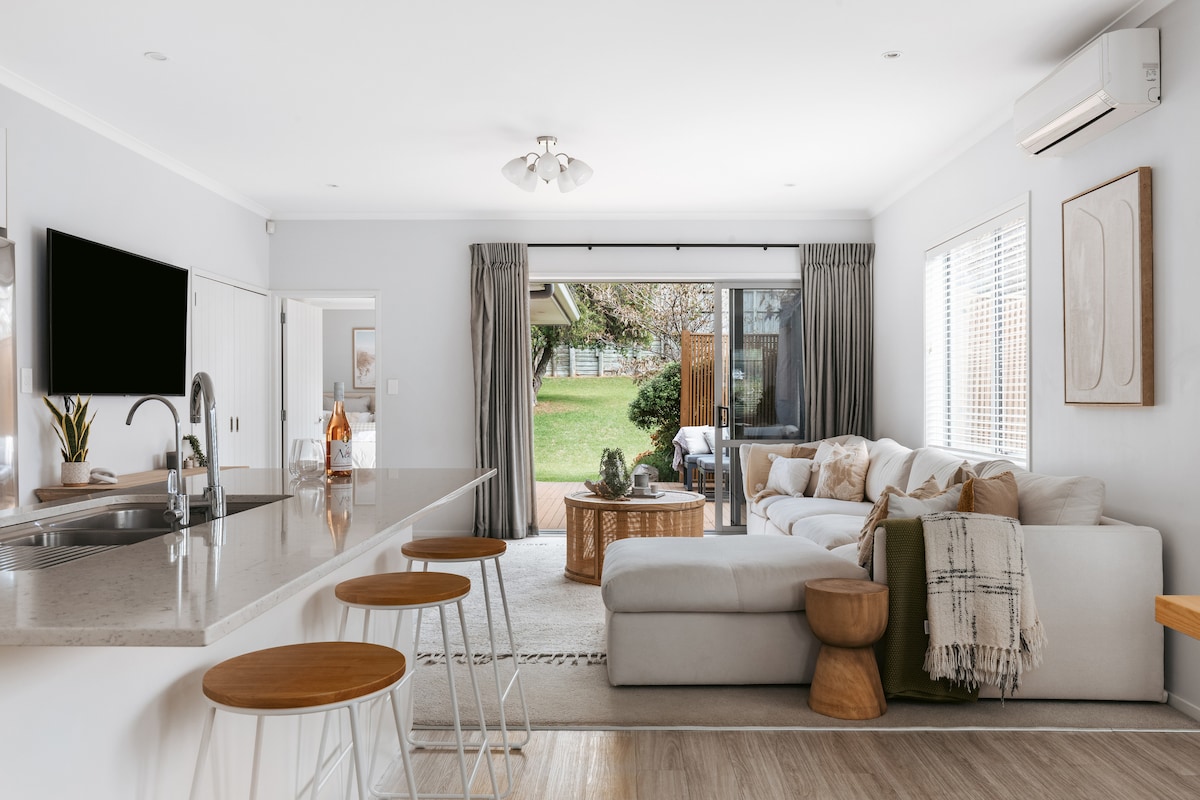Gorgeous 2 bedroom fully self contained separate dwelling, comfortably accommodating 4 guests in 2 bedrooms. Has the option of 2 extra guests sleeping on a double sofa bed in lounge for short stays & by request only. Central Tauranga location, Otumoetai Bureta area 2 free off street parks. Private courtyard in a quiet street. 5min drive to Tauranga CBD & 15min drive to downtown Mt Maunganui. 10 min walk/2 min drive to shopping centre with Bureta Woolworths, liquor store, bar & restaurants
