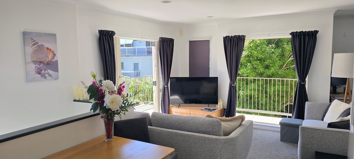 The Abode, a short walk to everywhere, is a cosy well appointed apartment, ideally situated in the heart of Mt Maunganui between the main surf beach & harbour. Enjoy views of the swimming pool and a glimpse through trees of the ocean from balcony. There is a sauna and gym. A private right of way to the ocean is a bonus .The Abode is an all-season getaway. Everywhere is a short walk; surf beach, harbour, Mt Mauao walking tracks, cafés, restaurants & boutique shopping on Mount MainStreet.